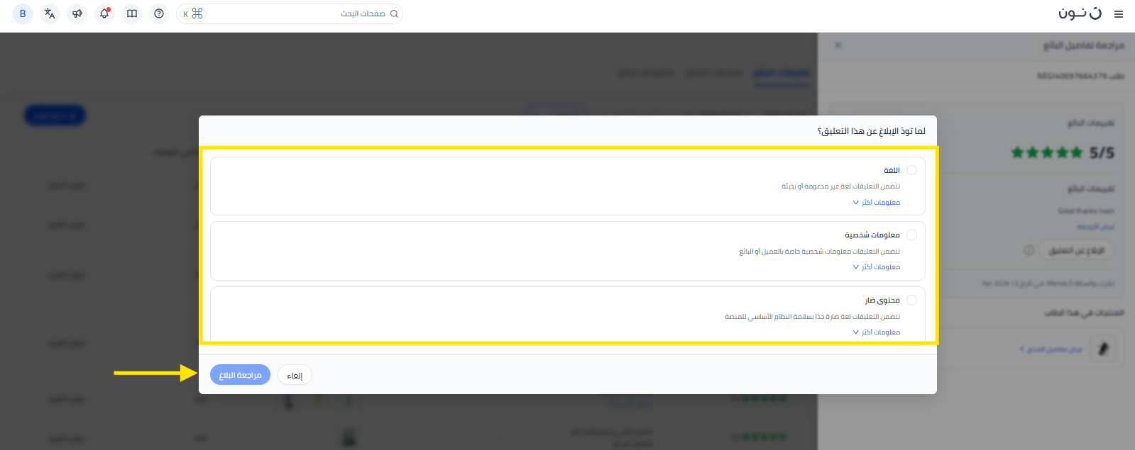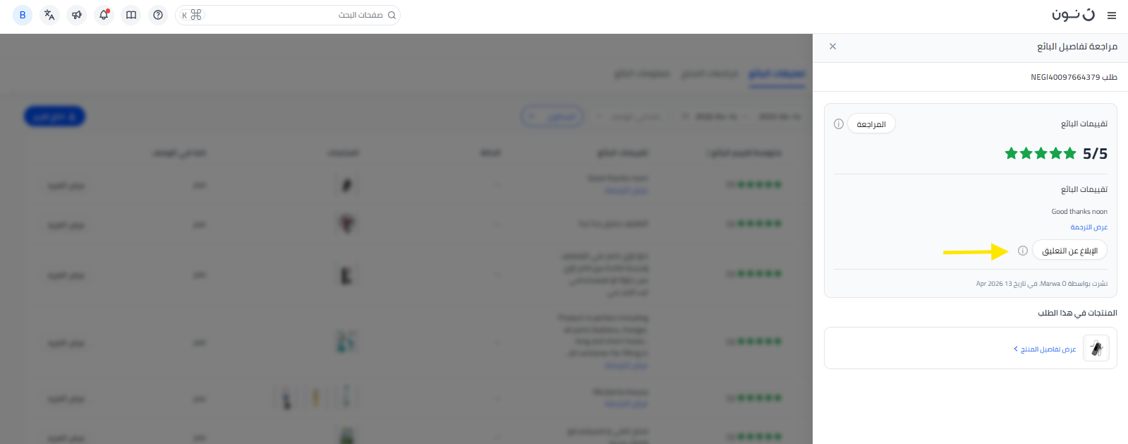 يجب أن تتوافق جميع تقييمات البائع التي ينشرها العملاء إرشادات مجتمع نون و إرشادات مراجعة البائع. أي محتوى يخالف هذه الإرشادات قد يكون عرضة للإبلاغ من قبل البائع.