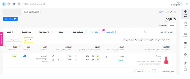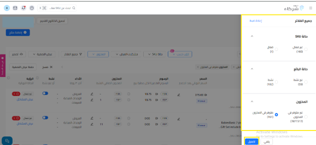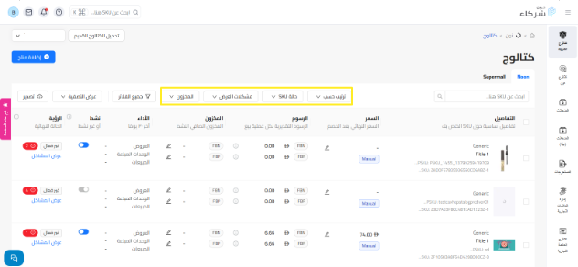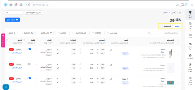 - نون: يُظهر هذا العرض وحدات SKU التي يتم بيعها بموجب نموذج بيع FBP ووحدات SKU التي قمت بنقل المخزون الخاص بها إلى مستودع نون.