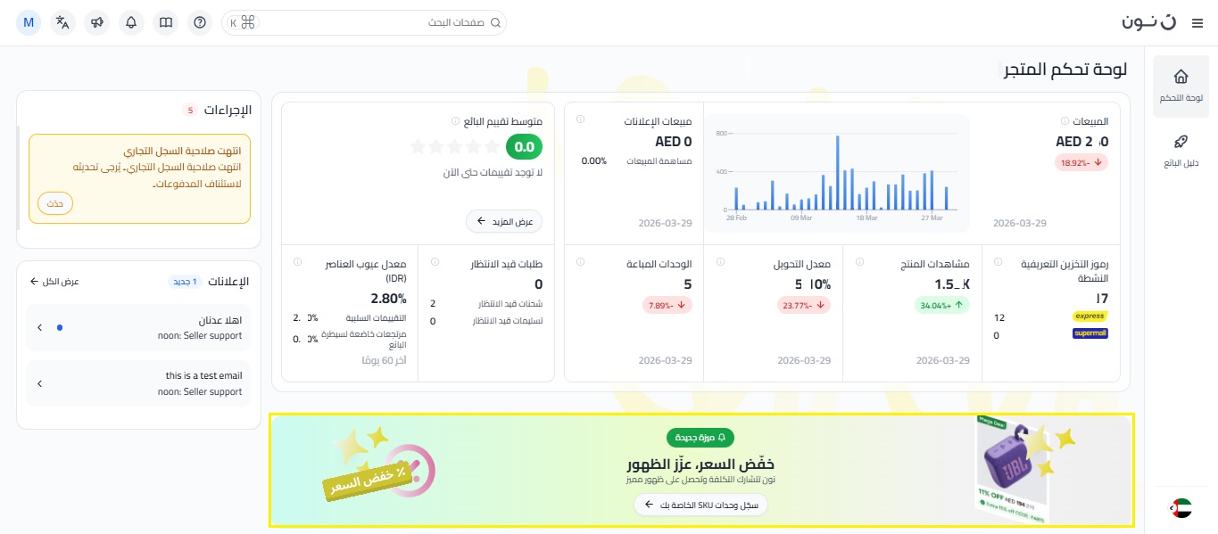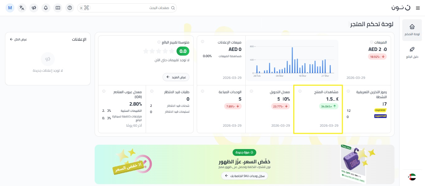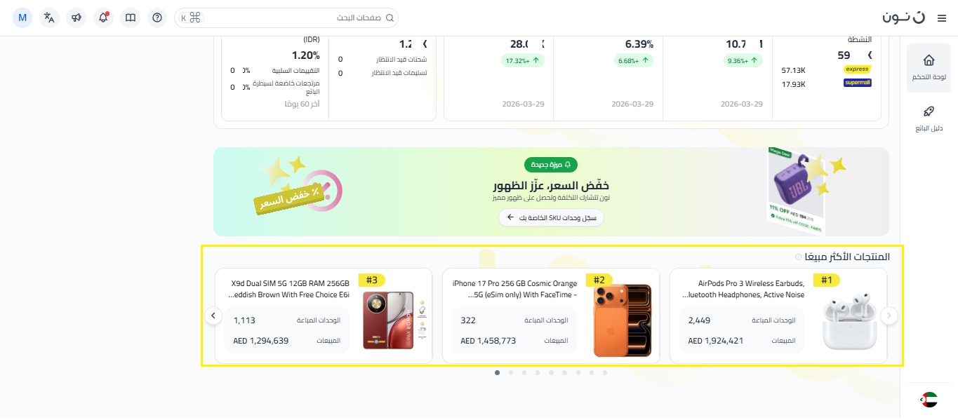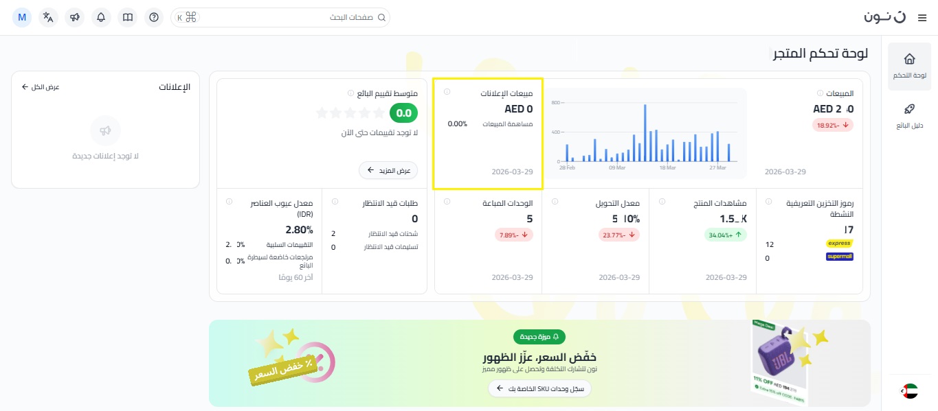 مبيعات الإعلانات والإنفاق الإعلاني: إذا كنت مشتركًا في خدمة إعلانات نون، يمكنك الاطلاع على إجمالي مبيعات الإعلانات من يوم أمس، والنسبة المئوية لمبيعاتك الإجمالية التي جاءت من الإعلانات. للحصول على رؤية أكثر تفصيلاً لأداء حملاتك، اضغط على زر السهم للوصول إلى إدارة الإعلانات.