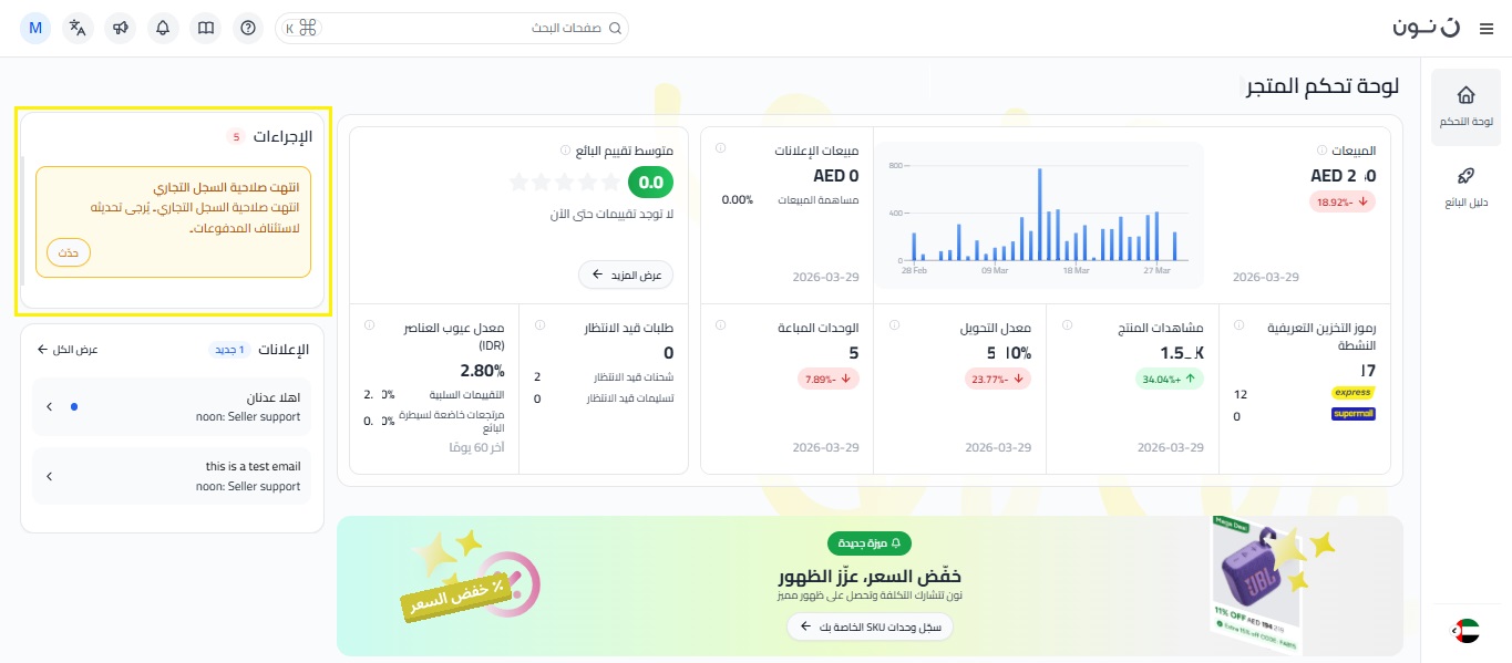 توفر لوحة تحكم المتجر في موقع البائع نظرة شاملة على أداء عملك على منصة نون. تم تصميمها لإبراز أهم المؤشرات والمهام العاجلة، حيث يتيح لك هذا المركز الموحد متابعة نمو متجرك واتخاذ إجراءات فورية بشأن الأمور الأكثر أهمية في رحلتك كبائع.