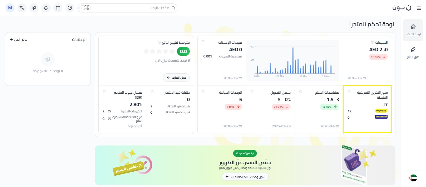 رموز التخزين التعريفية النشطة : يعرض هذا القسم إجمالي عدد المنتجات المرئية حاليًا للعملاء على نون، بما في ذلك تفصيل لرموز التخزين التعريفية لمنتجات إكسبرس (التي تحمل علامة نون إكسبرس)، و رموز التخزين التعريفية الموجودة على السوبر مول (رموز التخزين التعريفية النشطة على supermall ).