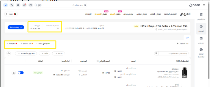 -بمجرد تسجيل الـ SKU، ستتمكن من متابعة أداء العروض. يمكنك رؤية عدد المنتجات المباعة وقيمة المبيعات كما يمكنك الاطلاع على الـمنتجات التي تم الموافقة عليها أو رفضها أو التي ما زالت قيد الانتظار وفقًا لترميز الألوان.