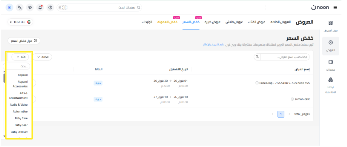 يمكنك تحديد البحث ضمن فئة منتجات معيّنة. استخدم مرشّح الفئة لعرض العروض الخاصة بقسم محدد فقط، مما يسهّل إدارة مجموعة منتجاتك المتنوعة.