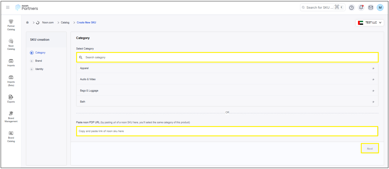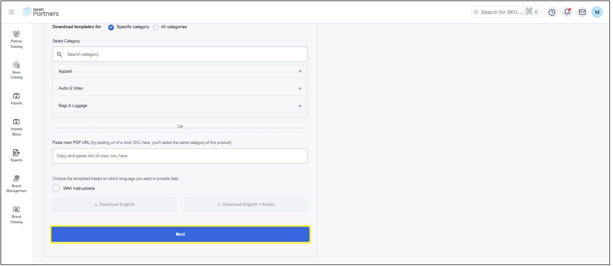 -سيتم توجيهك إلى الصفحة التي تحتاج فيها إلى اختيار الفئة. يمكنك اختيار الفئة بالبحث عنها، أو إدخال رابط PDP لمنتج مشابه لاختيار الفئة. ثم انقر على "التالي".
