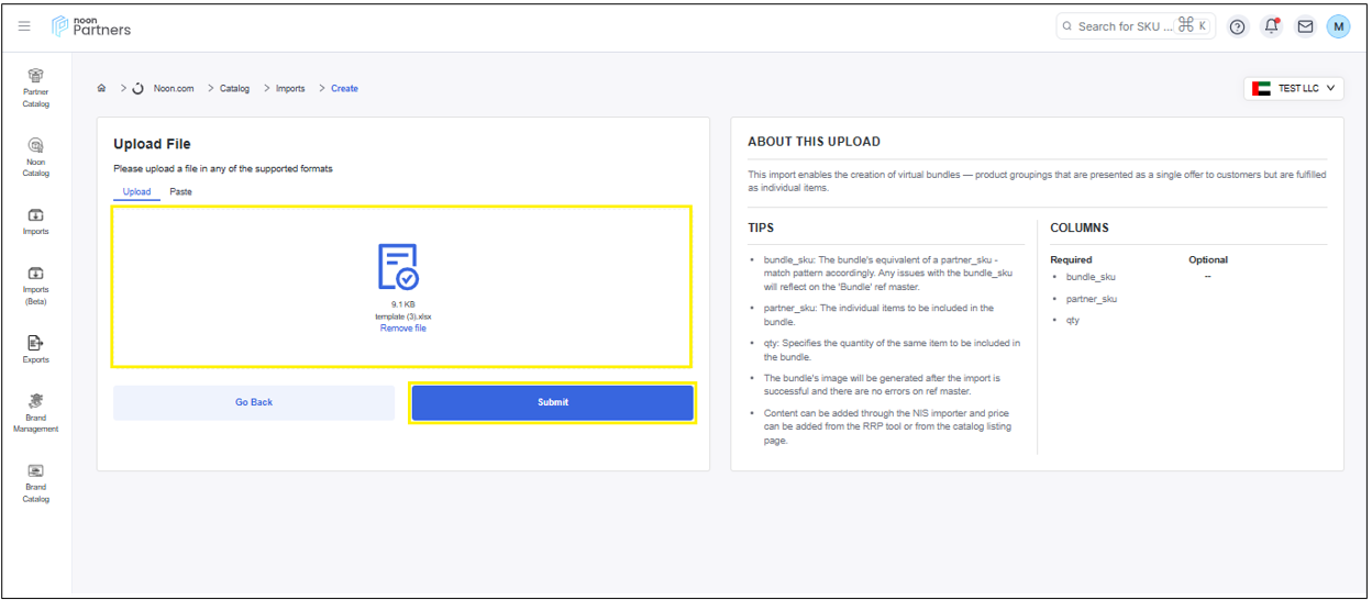 - في ملف إكسل الذي تم تنزيله، تحتاج إلى ملء SKU للحزمه، وهو اسم الحزمه، والكمية الخاصة بـ SKU في الحزمه، وSKU الشريك.