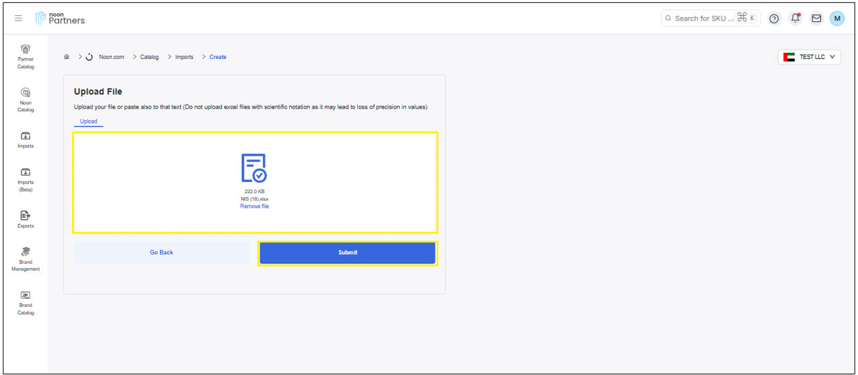 -بعد ملء النموذج، ارجع إلى "منصة شركاء نون" وحمّل الملف. ثم انقر على "إرسال".