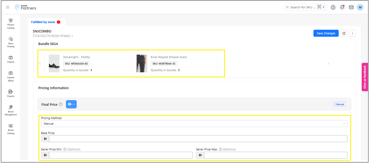 -سيتم توجيهك للأسفل إلى القسم الذي يعرض وحدات SKU في الحزمه، بالإضافة إلى خيار تحديث طريقة التسعير، والسعر الأساسي، ونطاق السعر الأدنى والأقصى للبائع. انقر على "حفظ التغييرات".