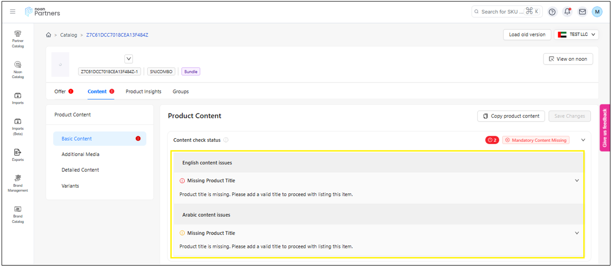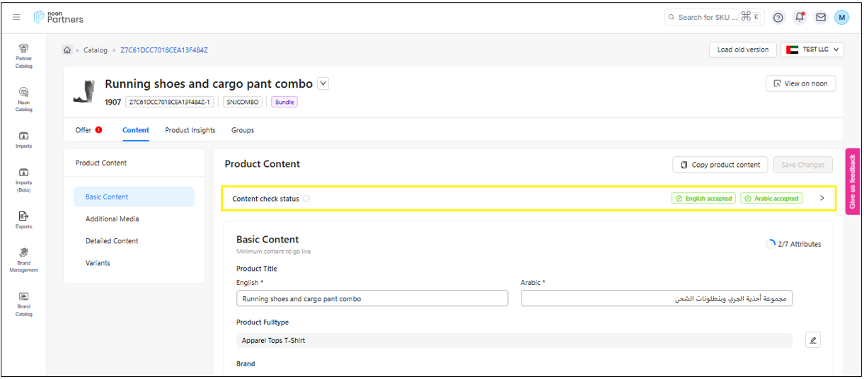 - في صفحة المحتوى، تظهر حالة فحص المحتوى أن المحتوى الإنجليزي والعربي مقبول.