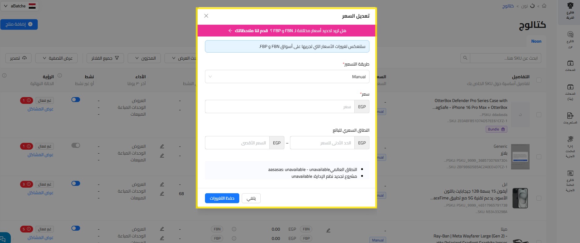 انقر على تعديل تحت عمود السعر .ستظهر نافذة منبثقة على الشاشة تتيح لك تغيير وتحديث تفاصيل السعر الخاصة بالمنتج.