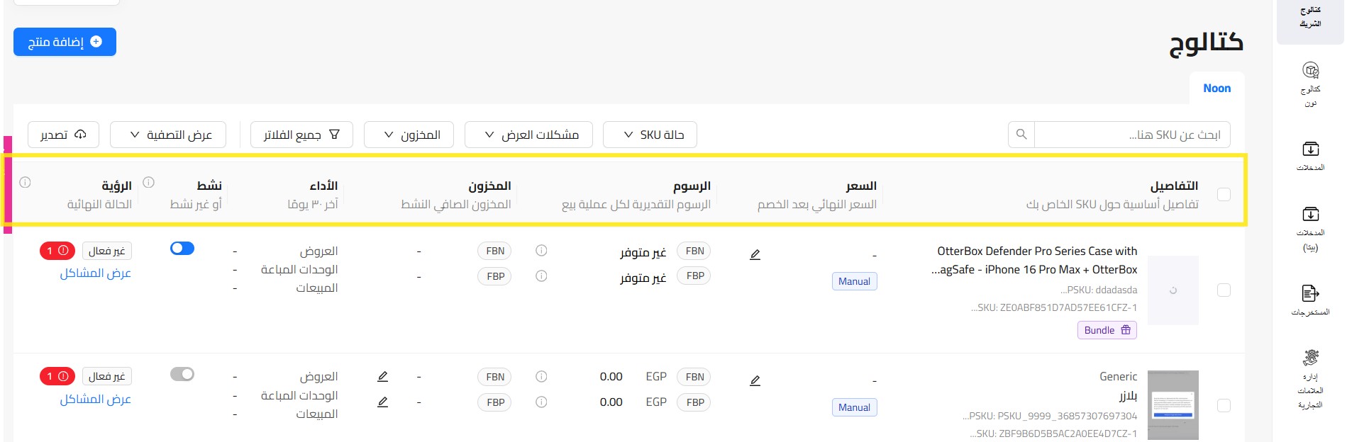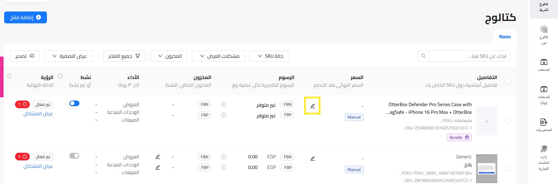سياسة محتوى رمز التخزين التعريفي للمنتج لدينا نوعان من العمليات لإدراج منتجاتك: 1. رمز التخزين التعريفي لنون (NSKU): ينطبق هذا على جميع المنتجات التي تخضع للرقابة من noon حيث يتم إنشاء المحتوى بواسطتك وإدارته وتعديله بواسطة نون. لا يمكنك تعديل أو حذف ...