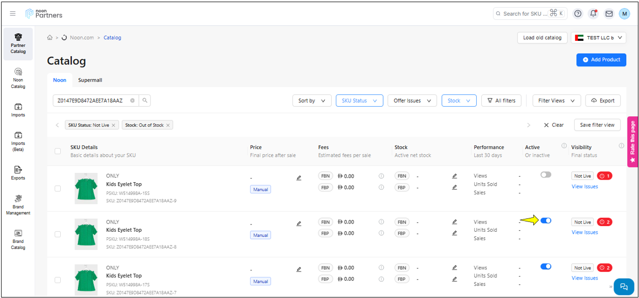 حالة تفعيل رمز التخزين التعريفي للمنتج SKU : تُظهر ما إذا كان رمز التخزين التعريفي للمنتج مفعّلًا أو غير مفعّل.