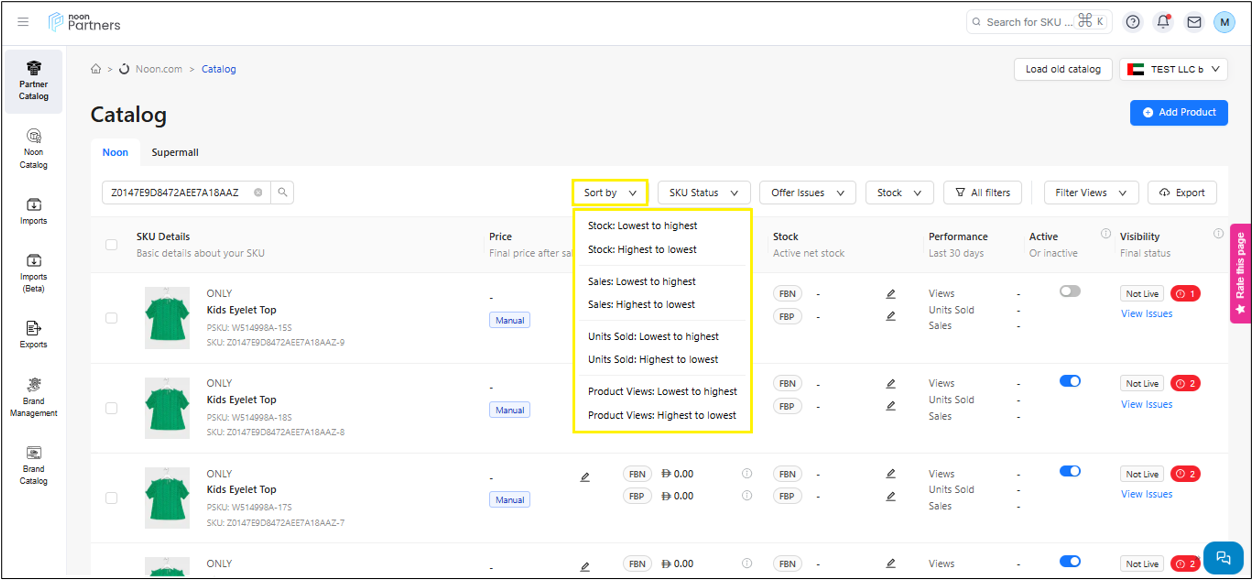 ستلاحظ وجود فلتر للأداء، والذي يتيح لك تصفية رموز التخزين التعريفية للمنتج في الصفحة بناءً على أداء المنتج، ويشمل ذلك المبيعات، عدد مشاهدات المنتج، عدد الوحدات المباعة.