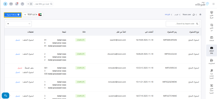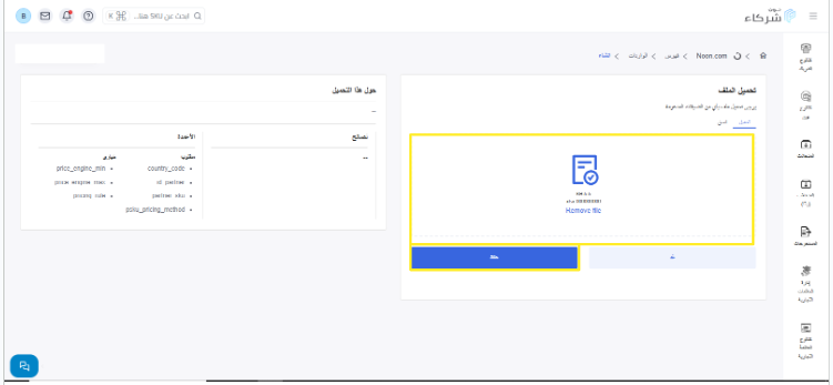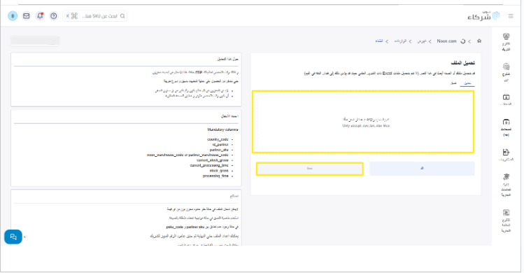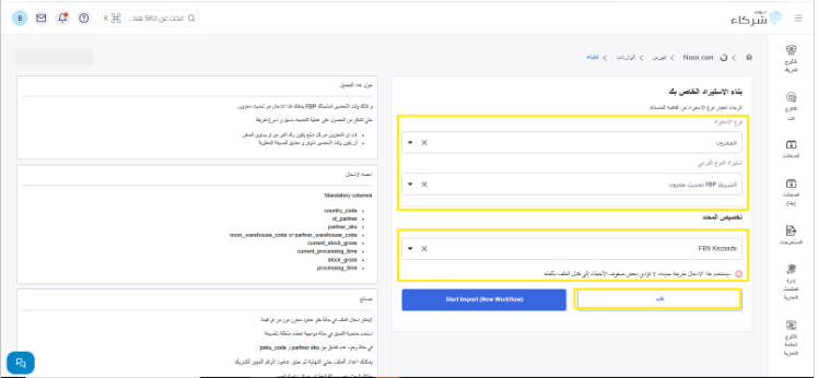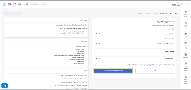 - بمجرد ملء الورقة بالمعلومات ذات الصلة، احفظ الملف وارجع إلى منصة شركاء نون وانقر فوق بدء الاستيراد (سير عمل جديد).