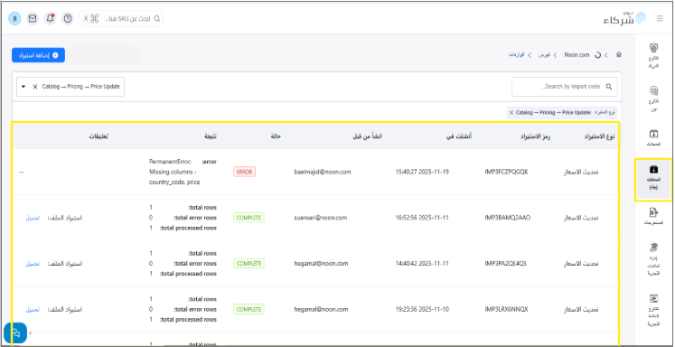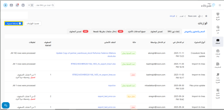 نصيحة: إذا لزم الأمر، يمكنك متابعة عملية الاستيراد بمشاركة رمز مرجع الاستيراد مع فريق دعم بائعي نون. بعد استيراد الملف بنجاح، ستتغير الحالة إلى "مُعالَج".