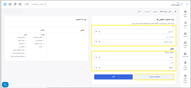 -اختر "السعر" كفئة، و"تحديث السعر" كفئة فرعية. اختر "فعال" كحالة المنتج و"السوق" نون " في قسم "التخصيص". ثم انقر على "طلب استيراد".