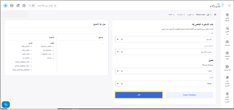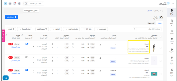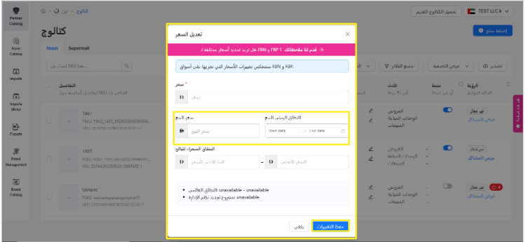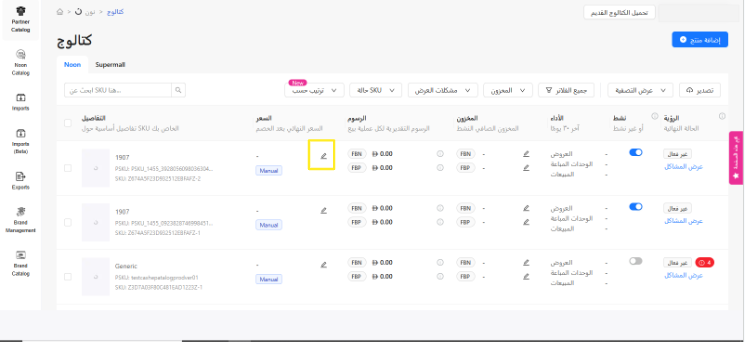 يمكن تعديل الأسعار مباشرة على صفحة تفاصيل المنتج داخل نصة شركاء نون، مما يسمح بإجراء تحديثات فورية لقوائم منتجاتك على نون. انقر فوق كتالوج الشريك ثم انقر فوق PSKU لتتمكن من تحديث السعر.