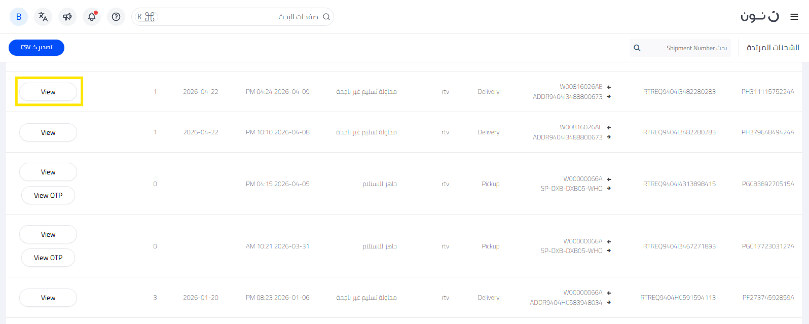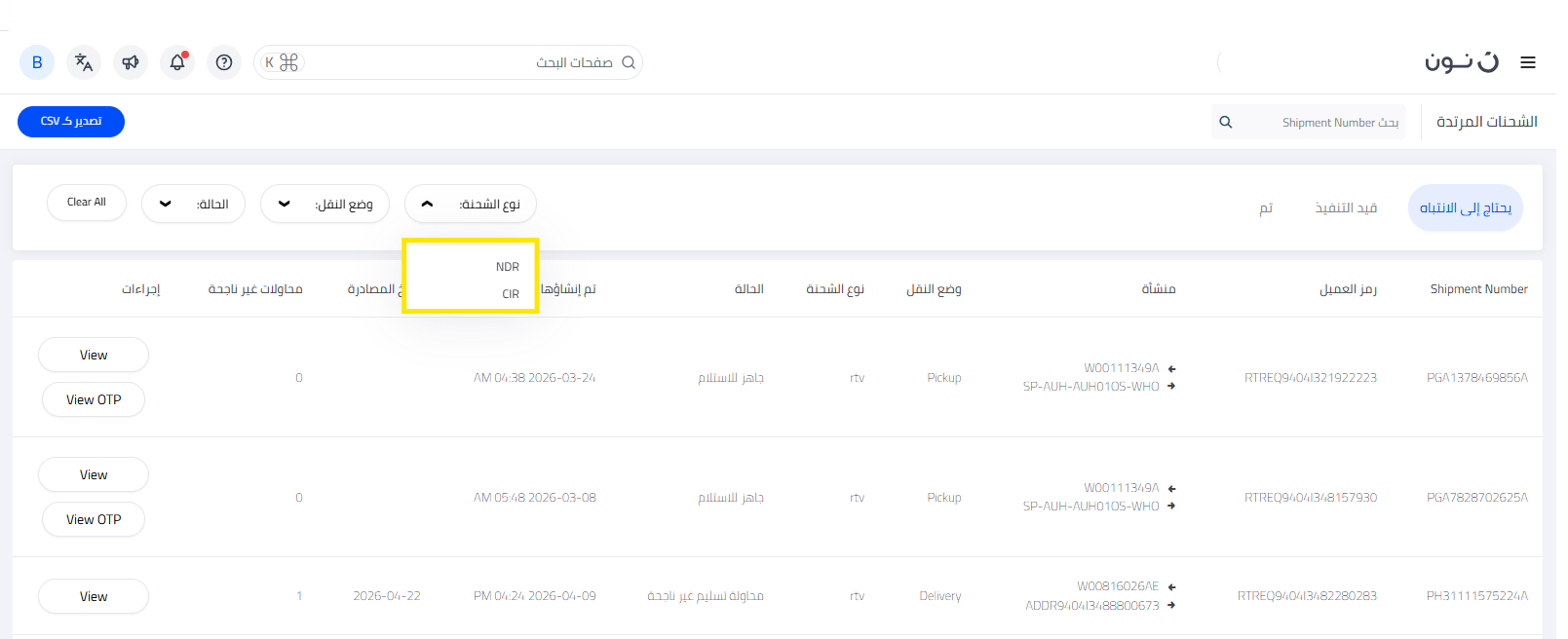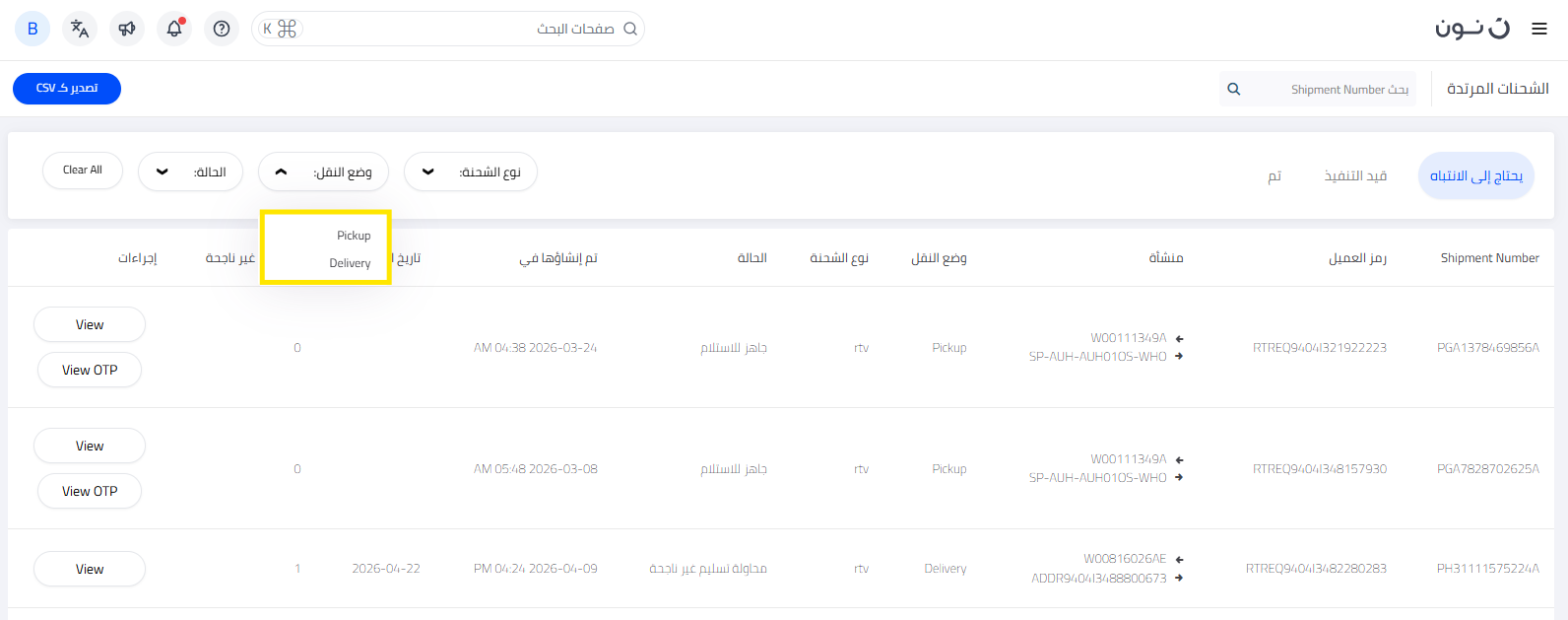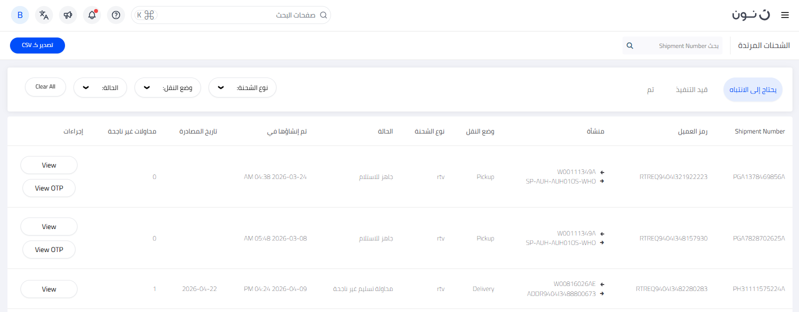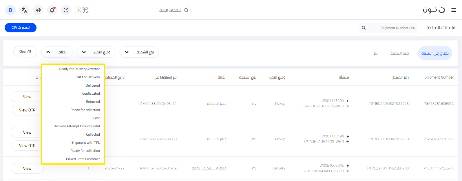 يمكنك تتبع جميع شحنات المرتجعات والإشعارات مباشرةً من خلال صفحة منقولات في منصة شركاء نون. تُصنّف صفحة منقولات شحنات المرتجعات إلى ثلاثة أقسام رئيسية بناءً على حالتها: