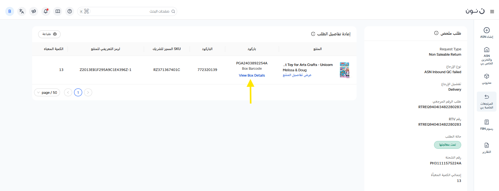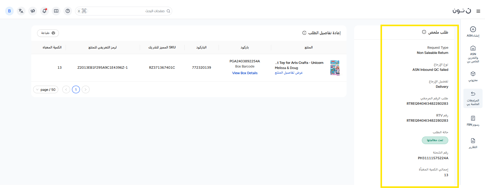 - ستتضمن التفاصيل نوع الطلب، ورقم مرجع الإرجاع، ورقم الشحنة، وإجمالي الكمية، وغيرها من المعلومات.