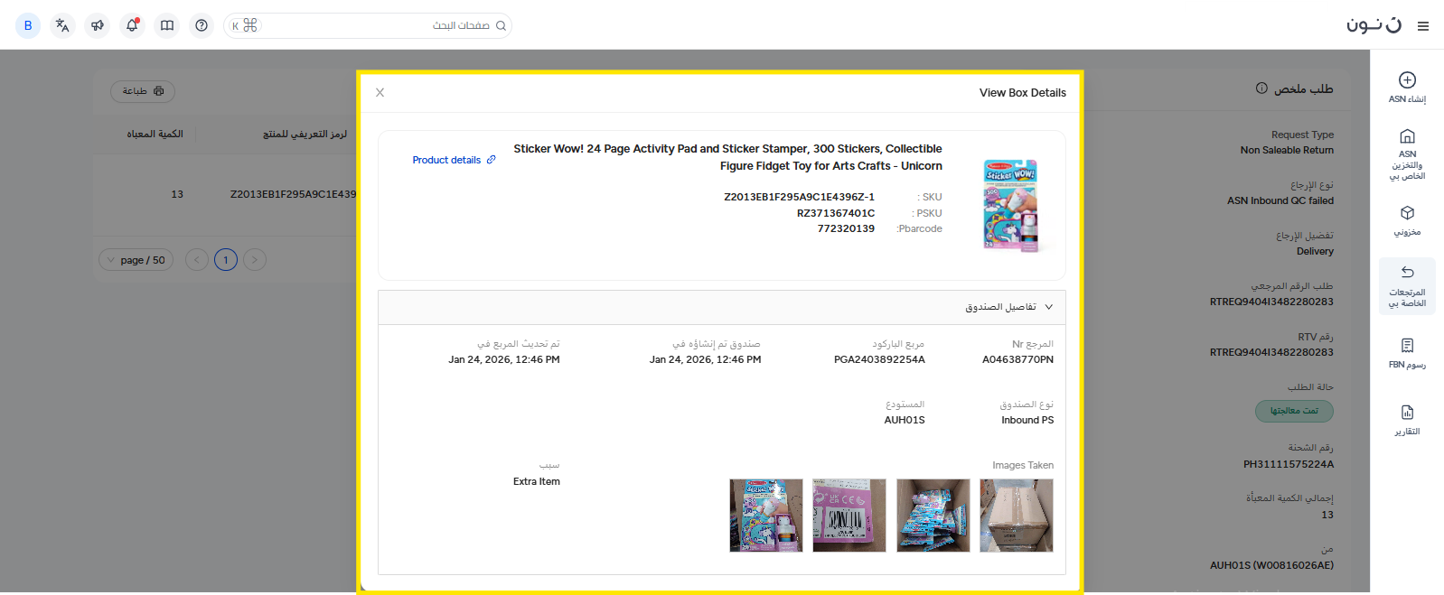 - في النافذة المنبثقة التي ستظهر، ستجد معلومات المنتج وتفاصيل الصندوق. تتضمن تفاصيل العلبة بعض التواريخ المهمة، وسبب الإرجاع، وصور المنتج.