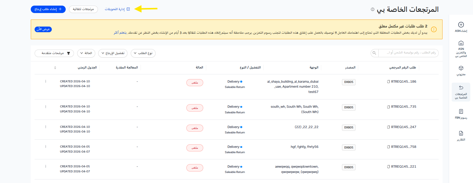 يشمل هذا القسم شحنات الإرجاع التي تتطلب إجراءً فوريًا، مثل: