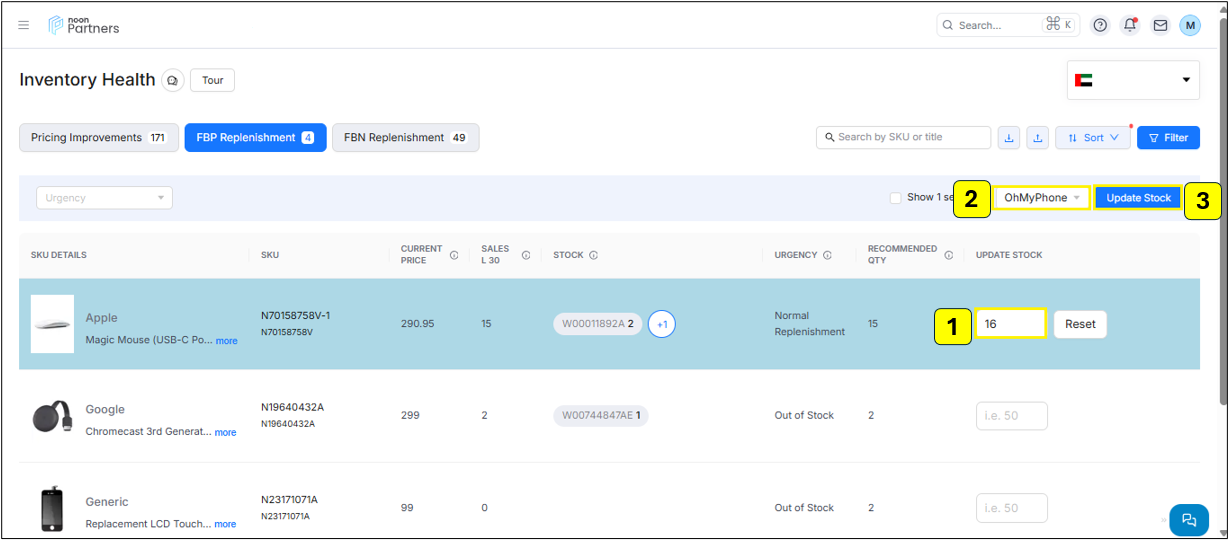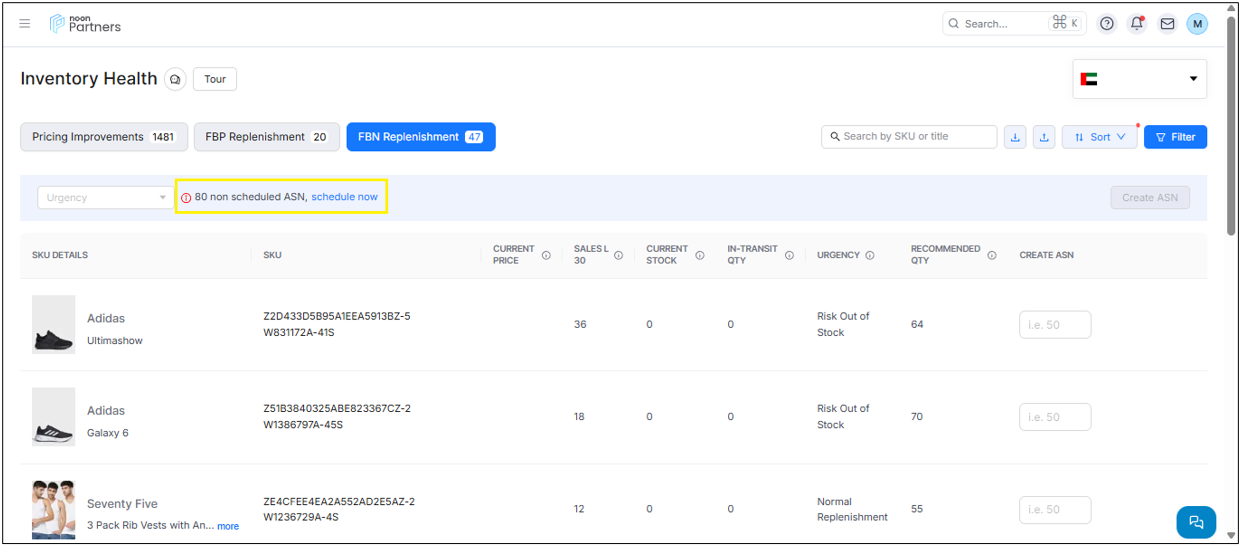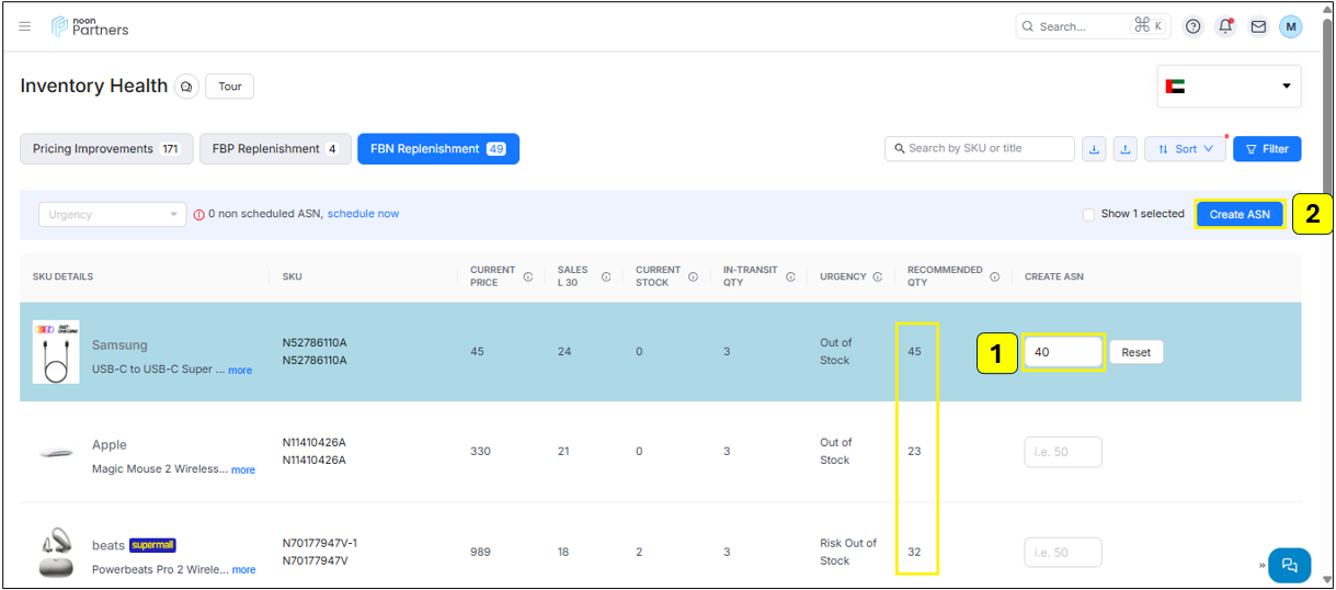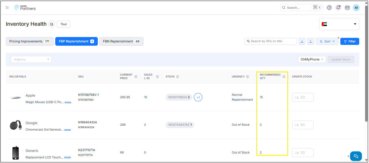 - ستجد الكمية الموصى بها لكل SKU، والتي تم اقتراحها من نون ليتم تجديدها، والتي تعتمد على المبيعات التاريخية للعنصر.