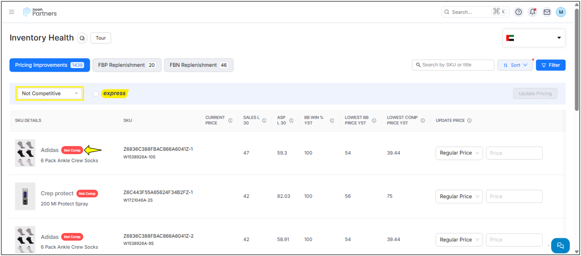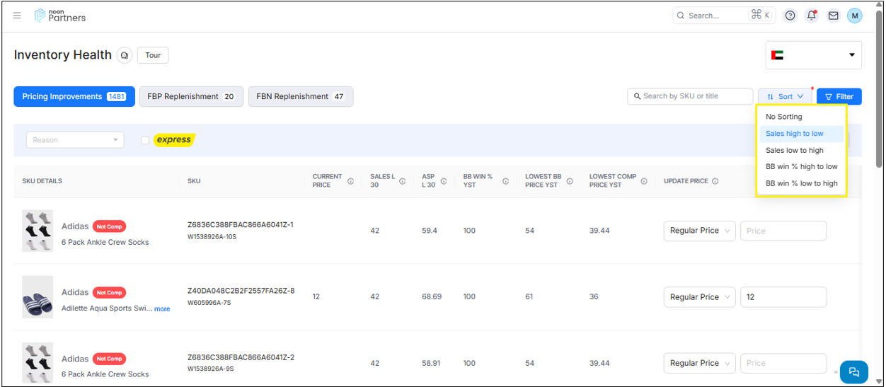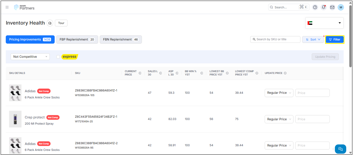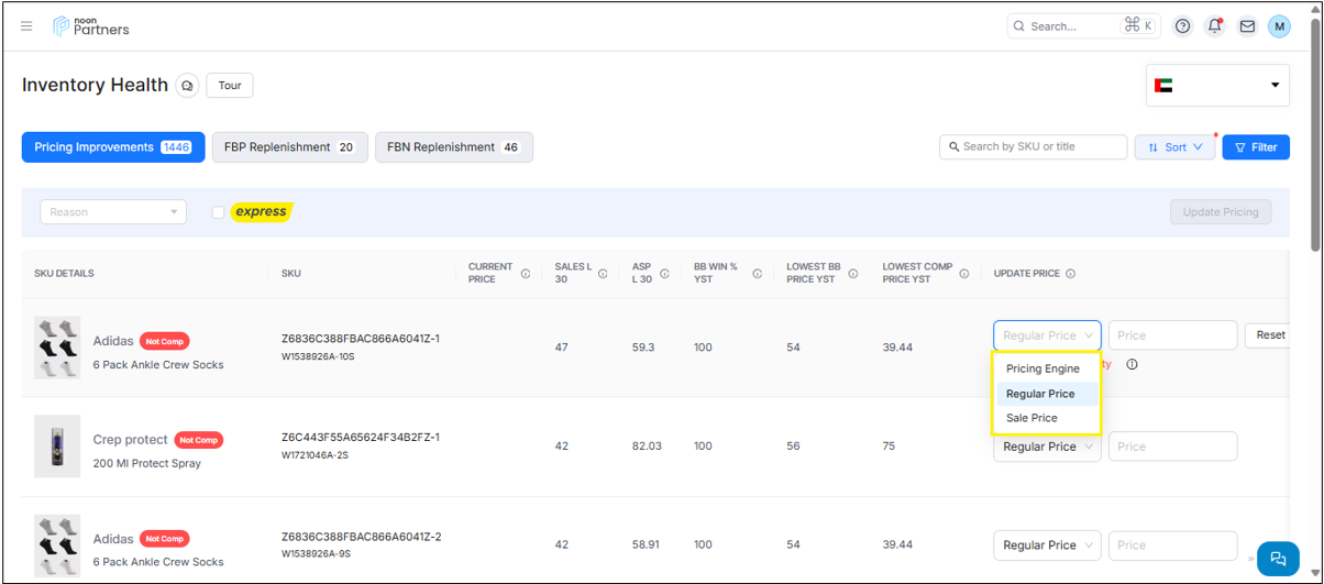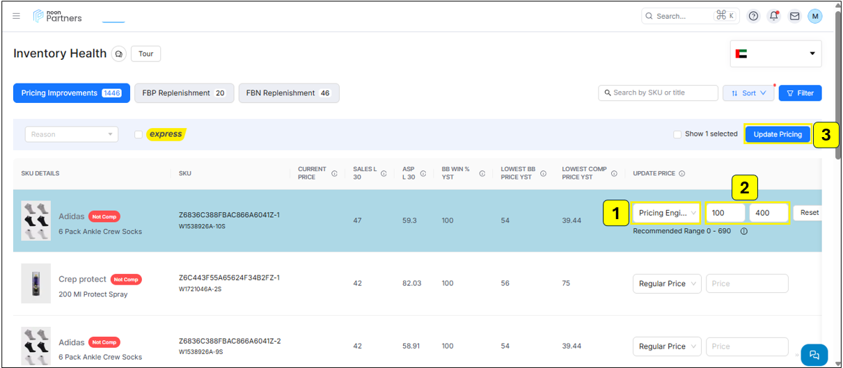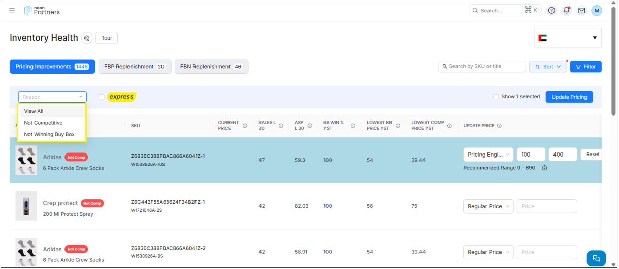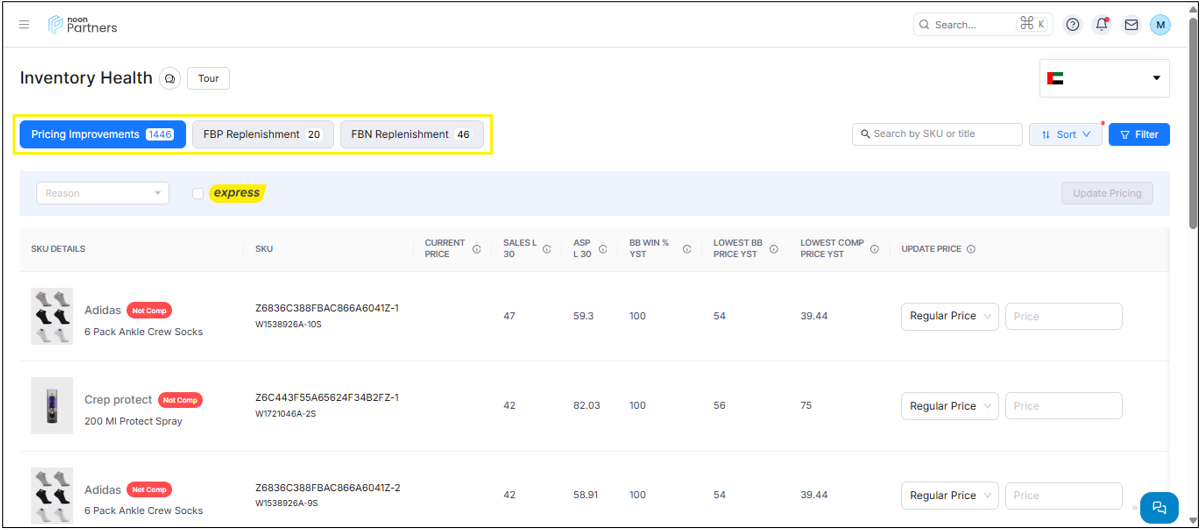 لوحة معلومات صحة المخزون أداة فعّالة مصممة لمساعدة البائعين على حل مشاكل المخزون من خلال تقديم توصيات لتحسين الأسعار وتحديث المخزون. سواء كنت تبيع من خلال نموذجي "الشحن بواسطة نون" (FBN) أو "الشحن بواسطة الشريك" (FBP)، توفر لوحة المعلومات اقتراحات في الوقت الفعلي لتحسين إدارة المخزون لديك.