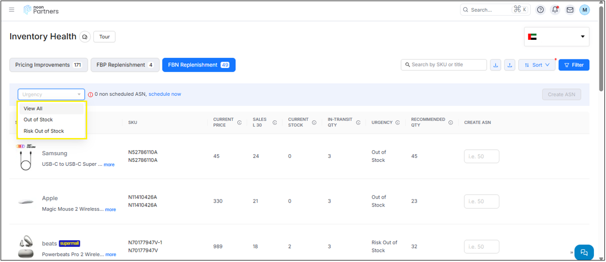 بإمكانك استخدام مرشح العرض المحدد، والذي يعتمد على مستويات الإستعجال هذه، لتصفية وحدات SKU التي تحتاج إلى اهتمام وتجديد فوري.