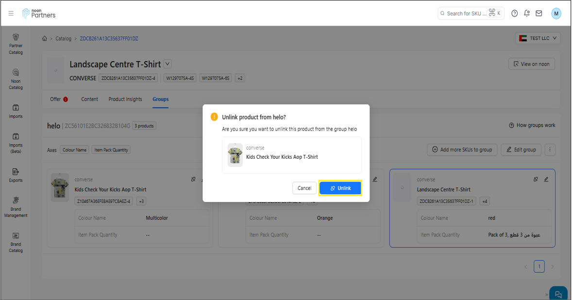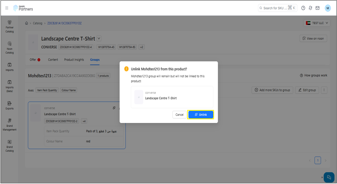 في النافذة المنبثقة التي تظهر، يطلب النظام تأكيدًا لفصل رمز المنتج (SKU) عن المجموعة. للمتابعة، انقر على زر "إلغاء الربط" الأزرق. سيؤدي هذا إلى فصل رمز المنتج (SKU) عن المجموعة.