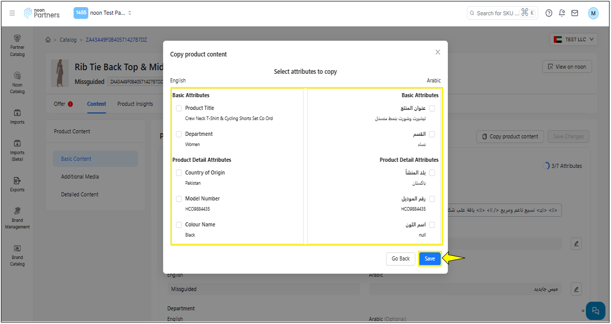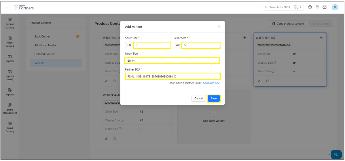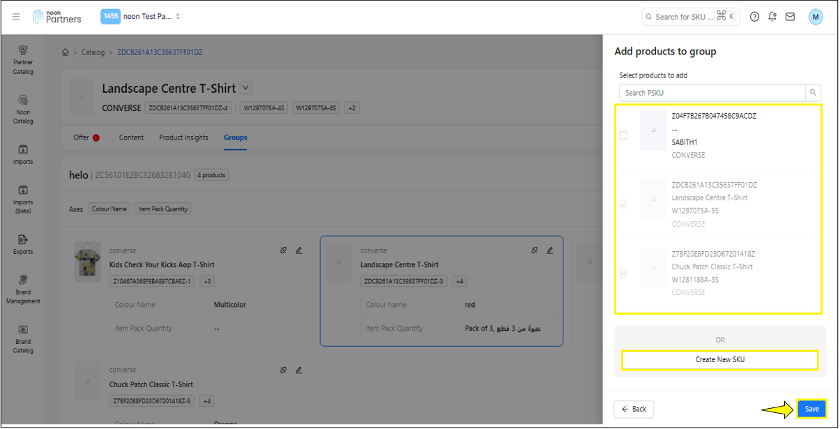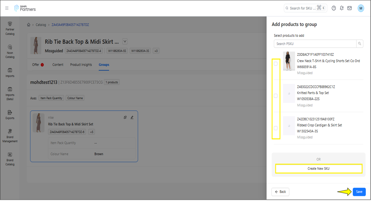 إضافة رمز SKU موجود: إذا كان هناك منتج بتصنيف مشابه، يمكنك تحديده ثم النقر على "حفظ"، سيؤدي هذا إلى إضافة رمز SKU إلى المجموعة.