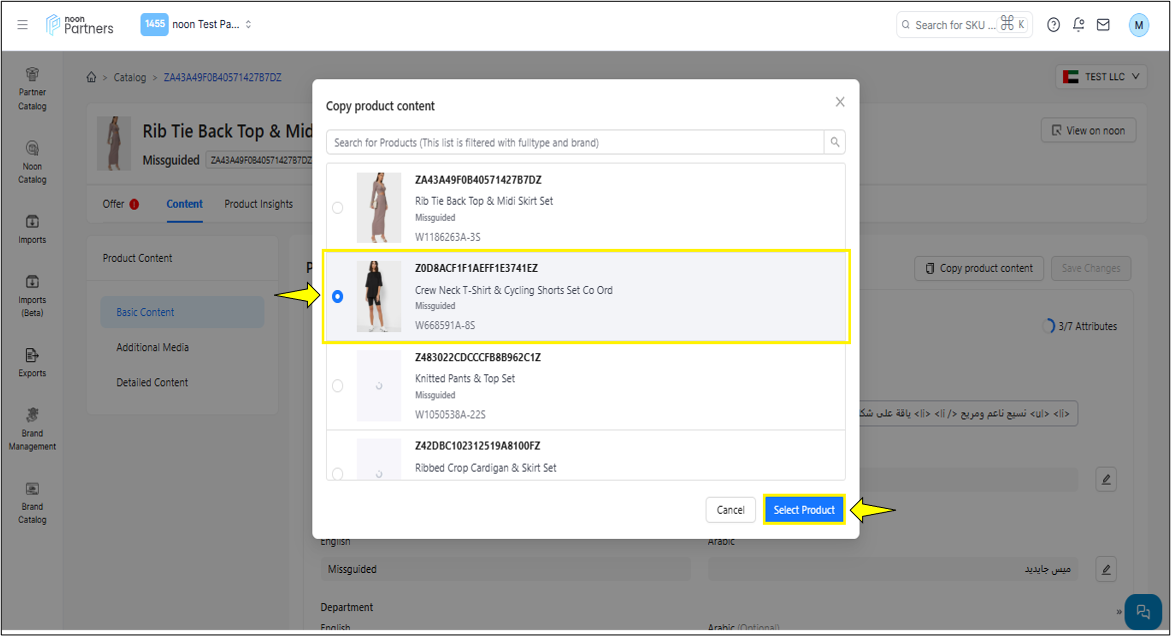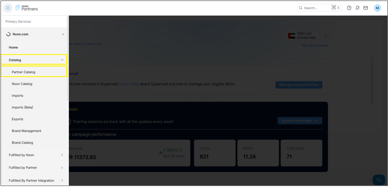 سجّل دخولك إلى منصة شركاء نون، وانقر على قائمة التنقل. ثم انقر على "الكتالوج" واختر "كتالوج الشريك".