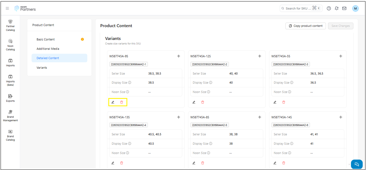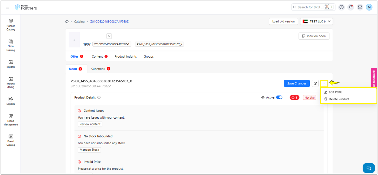 يوفر زر الإجراء خيارًا لتعديل PSKU وحذف المنتج.