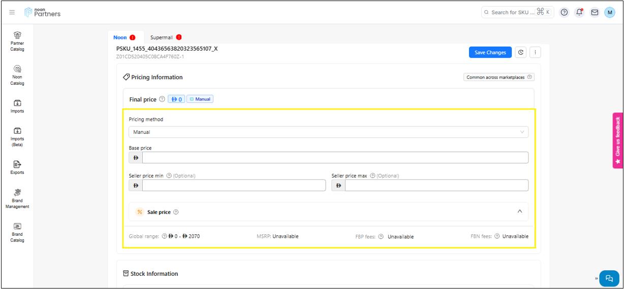 -القسم الأول في تبويب العروض هو التسعير. يمكنك تحديث سعر منتجك بسهولة في هذا القسم. يمكنك تحديد طريقة التسعير، سواءً يدويًا أو عبر محرك التسعير، لتسعير منتجاتك. ستشاهد أيضًا النطاق العالمي، وعليك تسعير منتجك ضمن هذا النطاق.