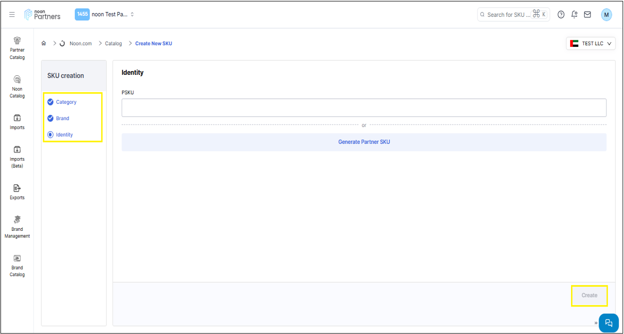 -اختر الفئة والعلامة التجارية، ثم أدخل رمز المنتج (PSKU) للسلعة. ثم انقر على "إنشاء".