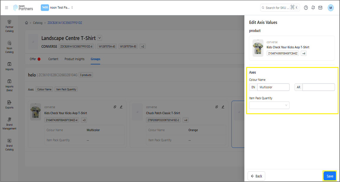 لتعديل قيمة المحاور انقر فوق زر تعديل الموجود على SKU.