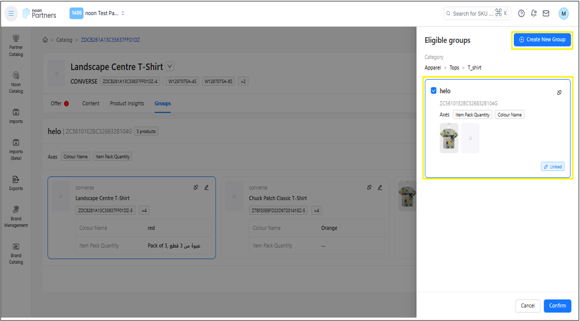 يمكنك إما ربط SKU بمجموعة موجودة أو إنشاء مجموعة جديدة عن طريق تحديد المحاور المشتركة للمجموعة.