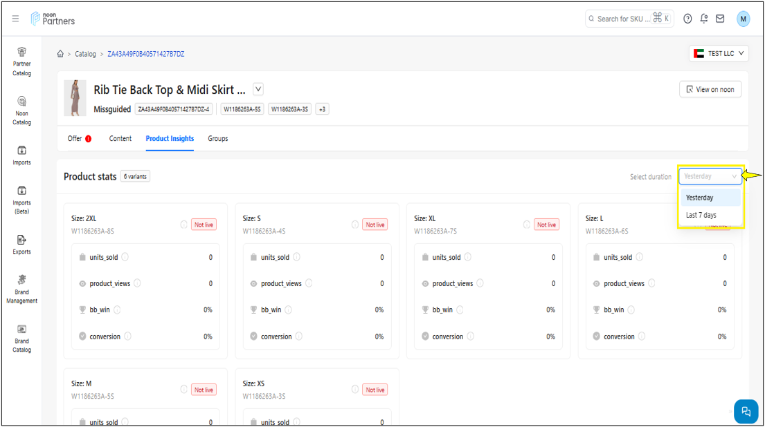 -سيتم تحويلك إلى صفحة الكتالوج حيث يمكنك الاطلاع على وحدات SKU التي أنشأتها. يعرض هذا القسم تفاصيل وحدة SKU، مثل رقم PSKU أو SKU، وسعر وحدة SKU، والرسوم التقديرية بناءً على نموذج البيع، وتفاصيل المخزون، وبيانات الأداء خلال الثلاثين يومًا الماضية، وحالة المنتج النشطة، وحالة العرض.