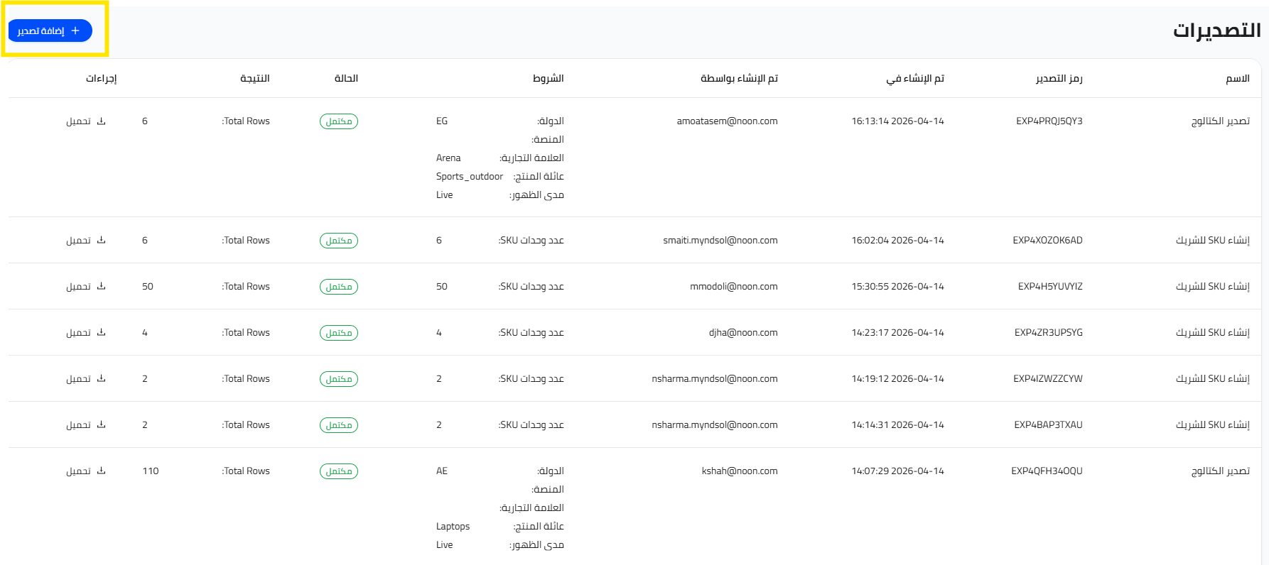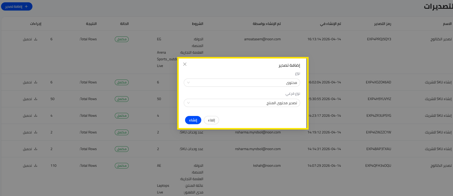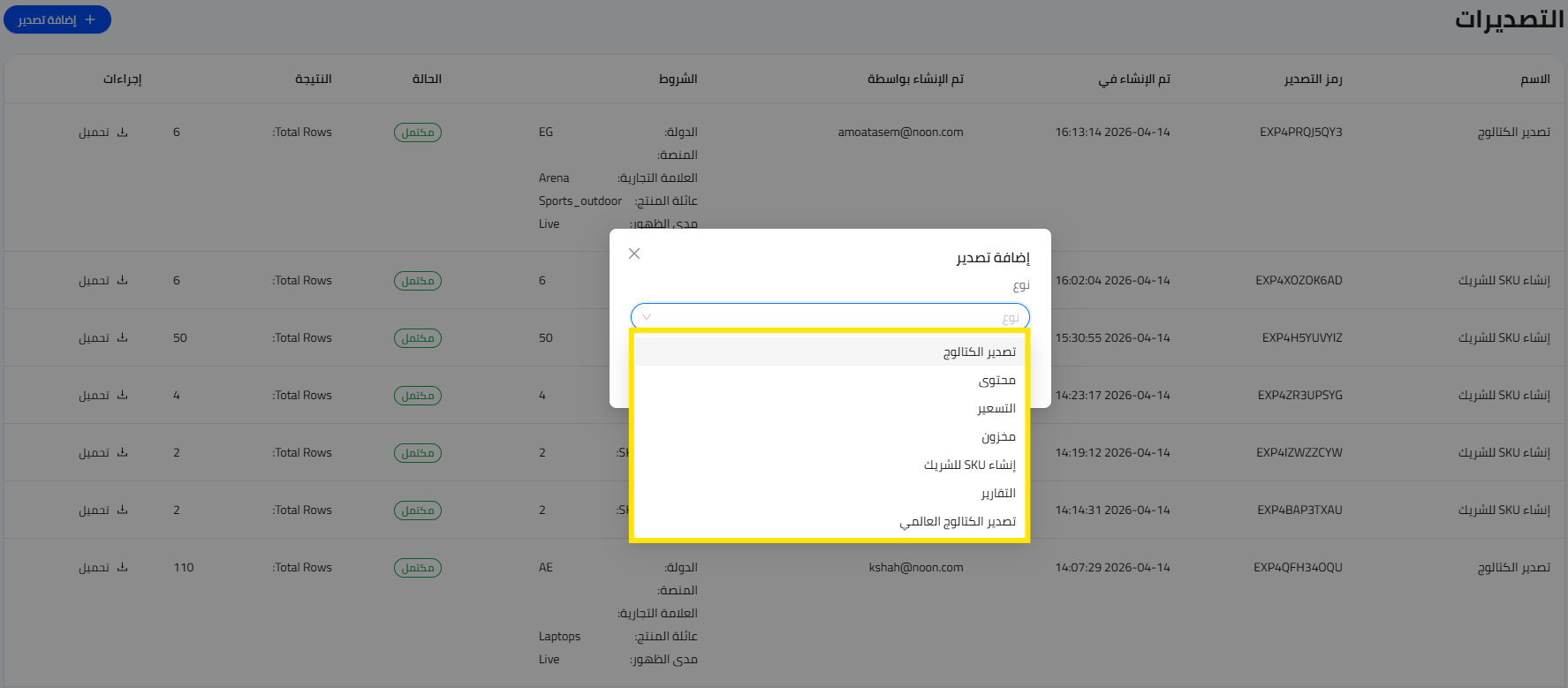 - في الكتالوج، انقر فوق المستخرجات ثم انقر فوق إضافة تصدير