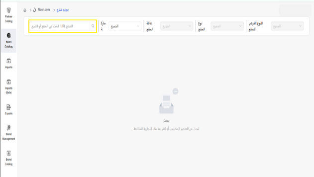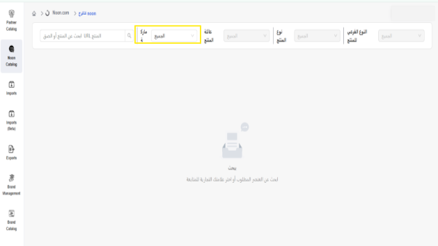 - لإدراج المنتج ضمن كتالوج نون باستخدام خيار البحث برمز التخزين التعريفي للمنتج SKU، قم بالبحث عن المنتج الذي ترغب في بيعه داخل كتالوج نون، ثم ابحث عن العلامة التجارية.