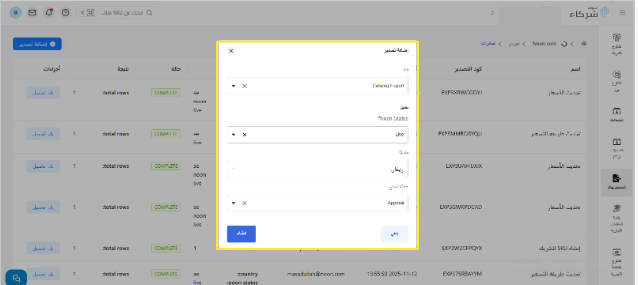 - اختر الفئة، حالة نون، العلامة التجارية، والعائلة. ثم انقر على "إنشاء" لطلب التصدير.