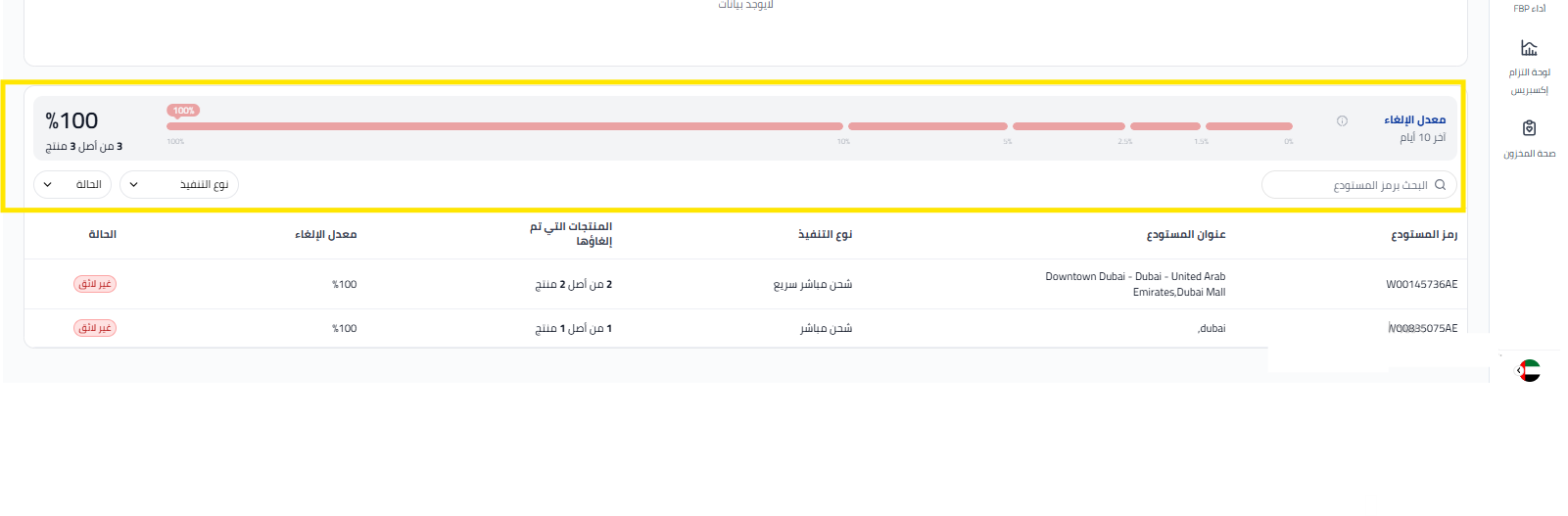 • قم بالتمرير لأسفل للتحقق من معدل الإلغاء (Cancellation Rate) ومواد التخزين (SKUs) التي تم إلغاؤها.