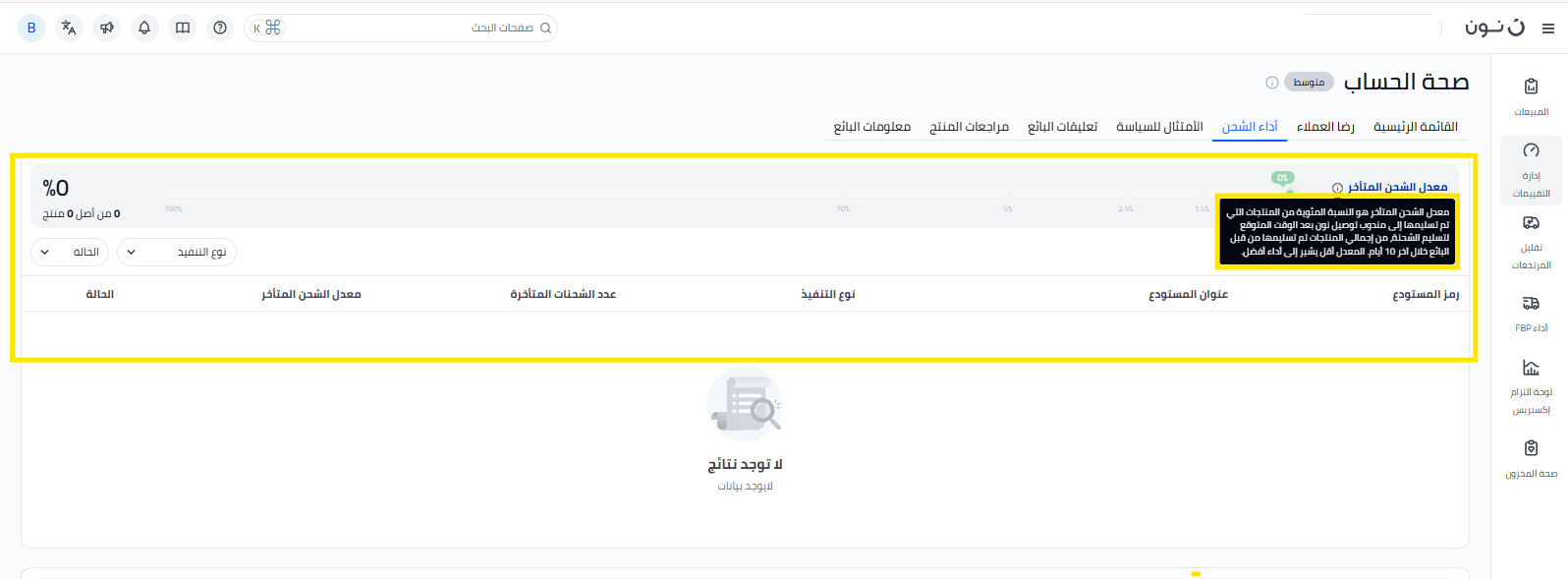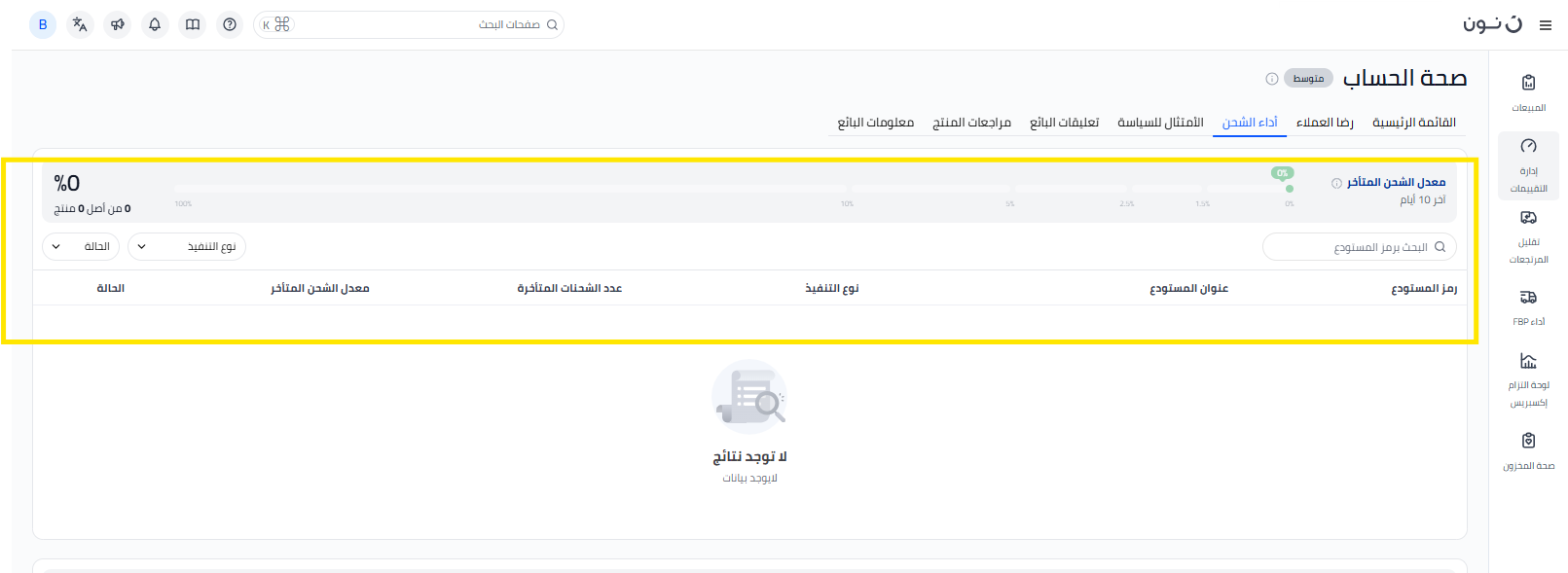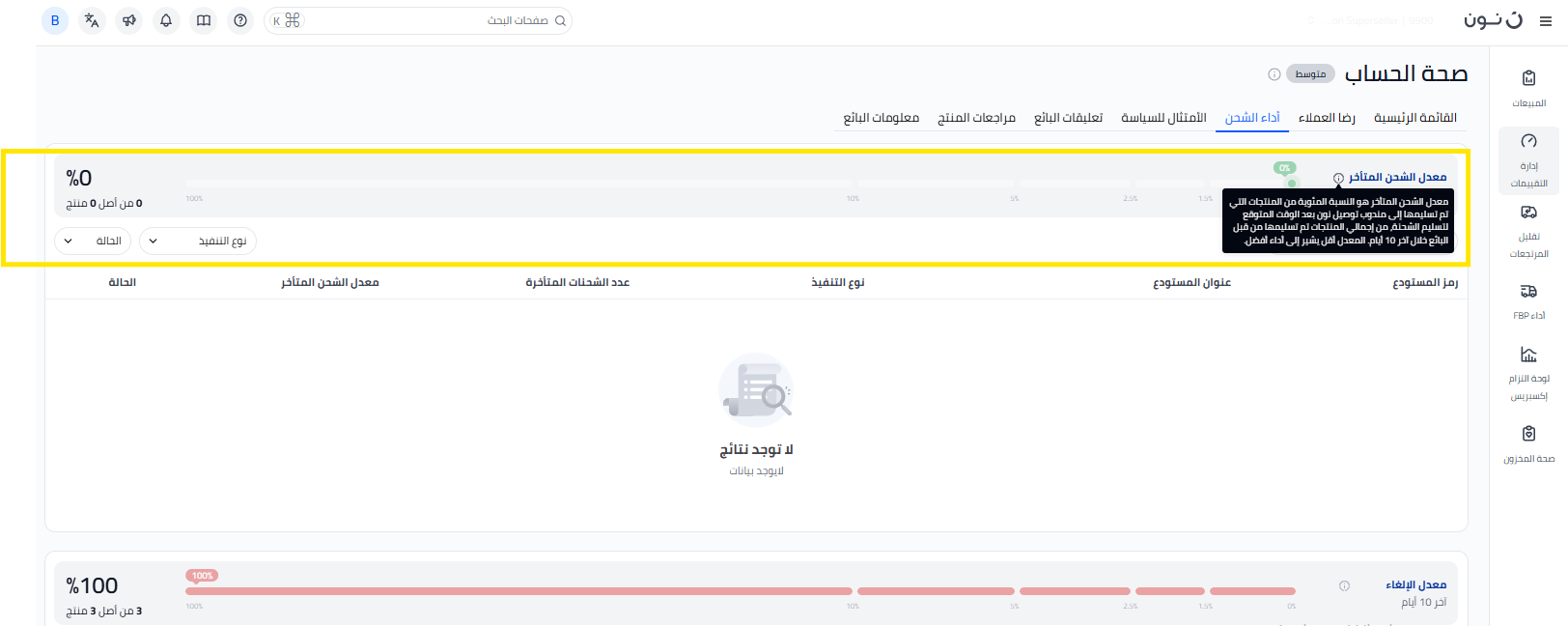 يمكنك متابعة معدل الإلغاء (Cancellation Rate) ومقاييس أداء المستودع الأخرى من قسم أداء الشحن (Shipping) ضمن "صحة الحساب" (Account Health).