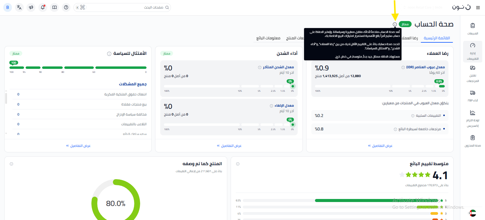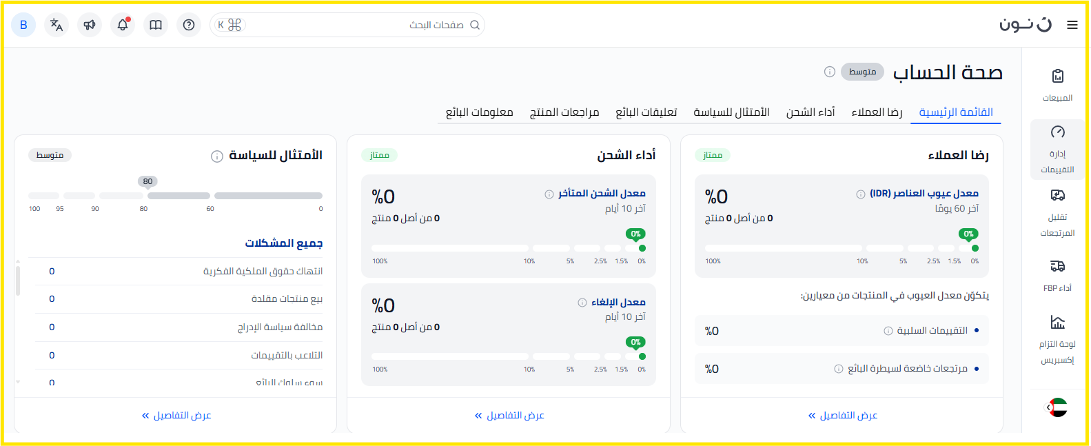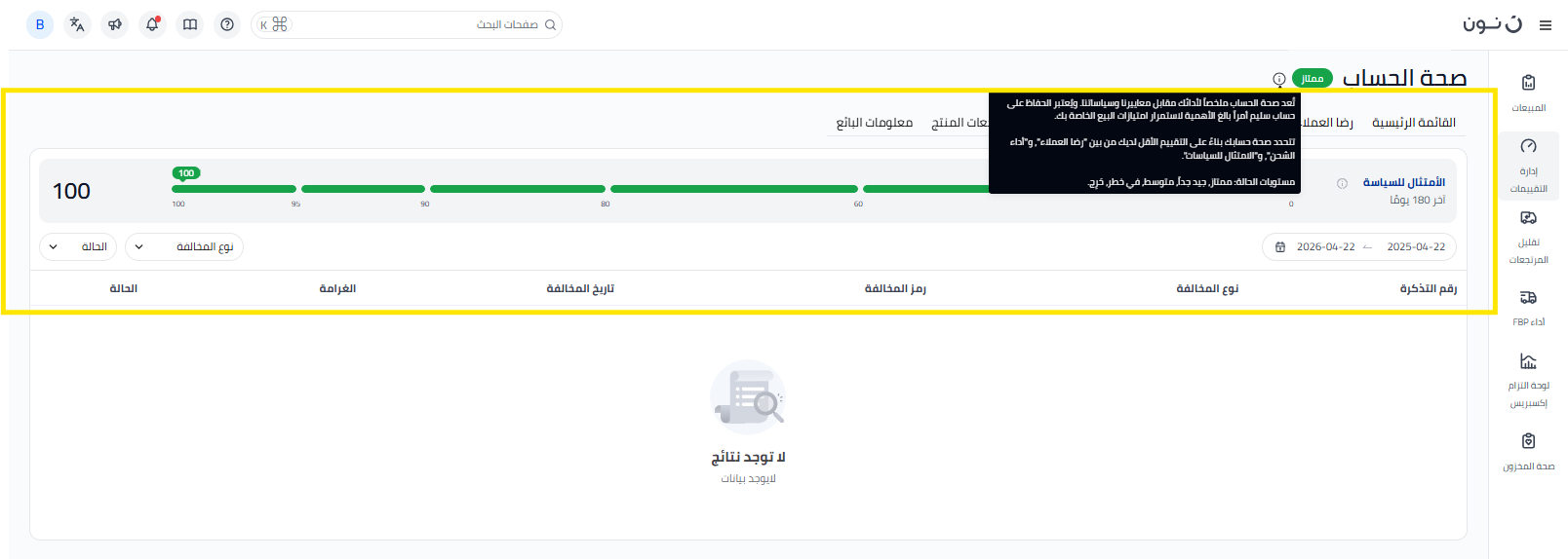 - كيف يؤثر هذا المؤشر عليك: يشير هذا إلى أن أحد معايير رضا العملاء، أو أداء الشحن، أو الامتثال للسياسات قد لا يتوافق مع سياسات نون، مما يعرض نون وأصحاب المصلحة الداخليين والخارجيين للخطر. قد يؤثر ذلك على ظهور عروضك على المنصة، وقد يؤدي إلى تعطيل حسابك إذا لم يتم اتخاذ أي إجراء تصحيحي.