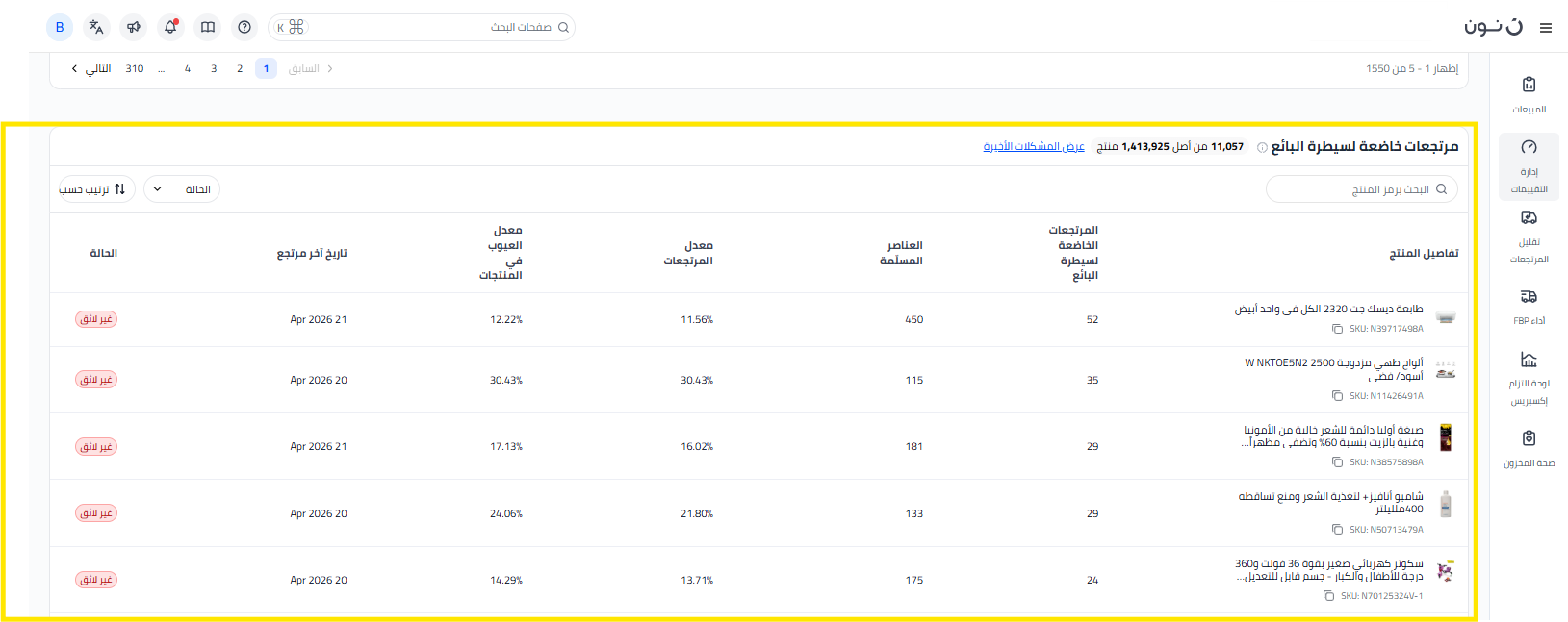 - المرتجعات: راقب اتجاهات المرتجعات وحدد الأسباب التي يمكن للبائع التحكم بها من خلال لوحة تقليل المرتجعات.