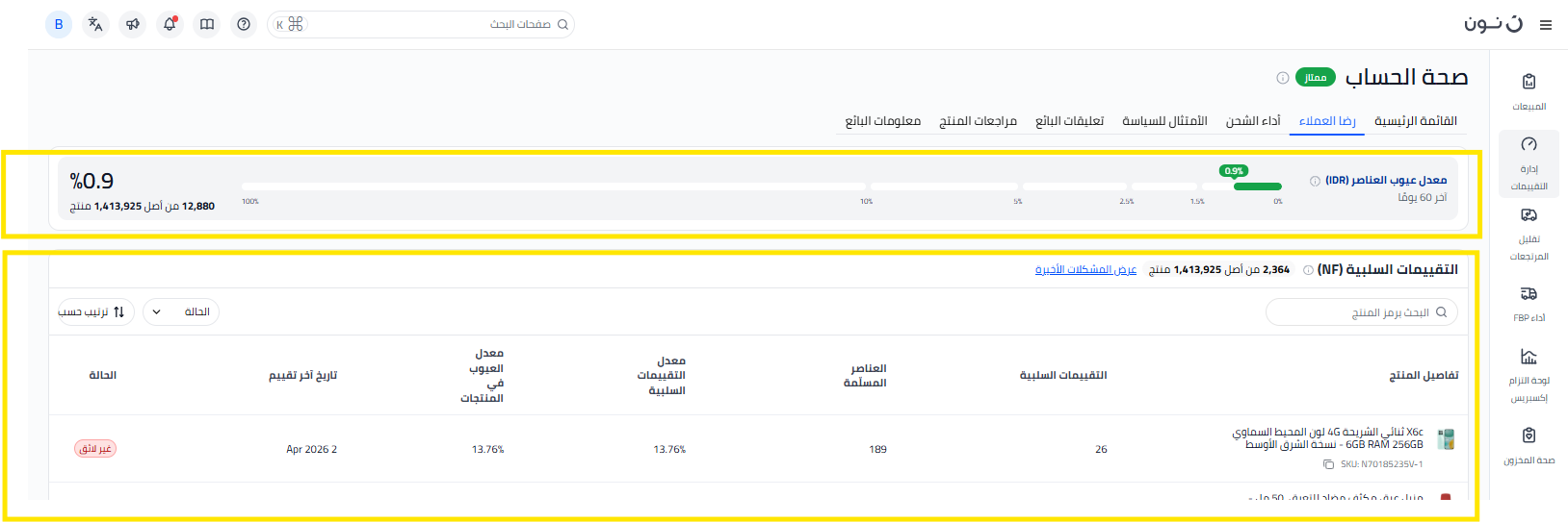 يمكنك الاطلاع على تفاصيل التقييمات السلبية والإرجاعات التي يمكن للبائع التحكم بها على مستوى العرض ضمن قسم "رضا العملاء" (Satisfaction).