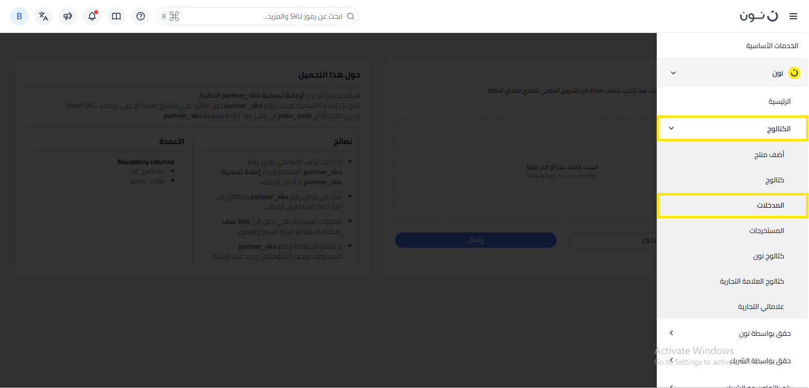 - من الكتالوج الخاص بك في القائمة اليمنى، اضغط علي الكتالوج ثم اضغط على المدخلات