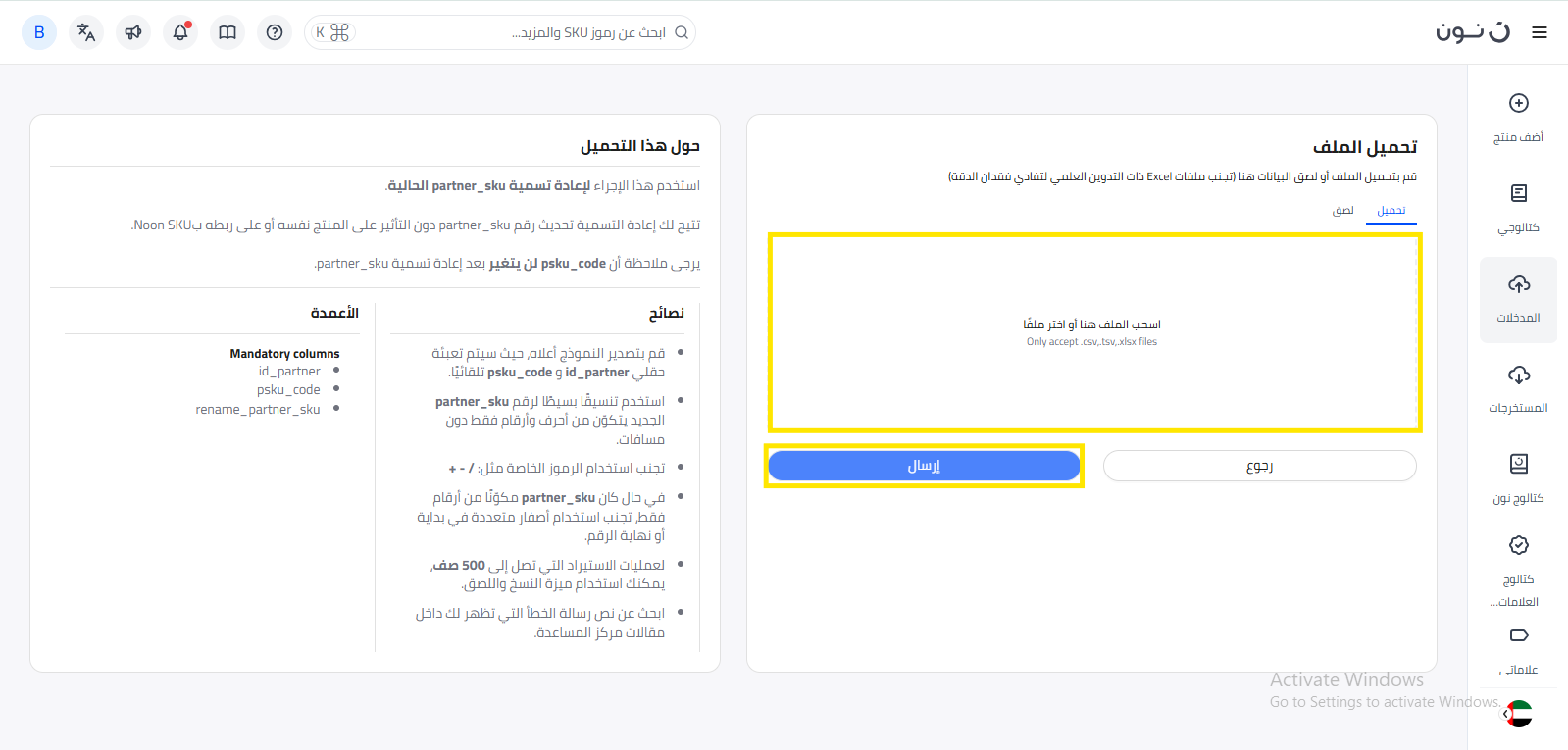 اسم الرمز المميز للشريك الخاص بك الجديد الذي تقوم بإدخاله باعتباره الاسم الجديد. | Atta2604 | مطلوب | rename_partner_sku |