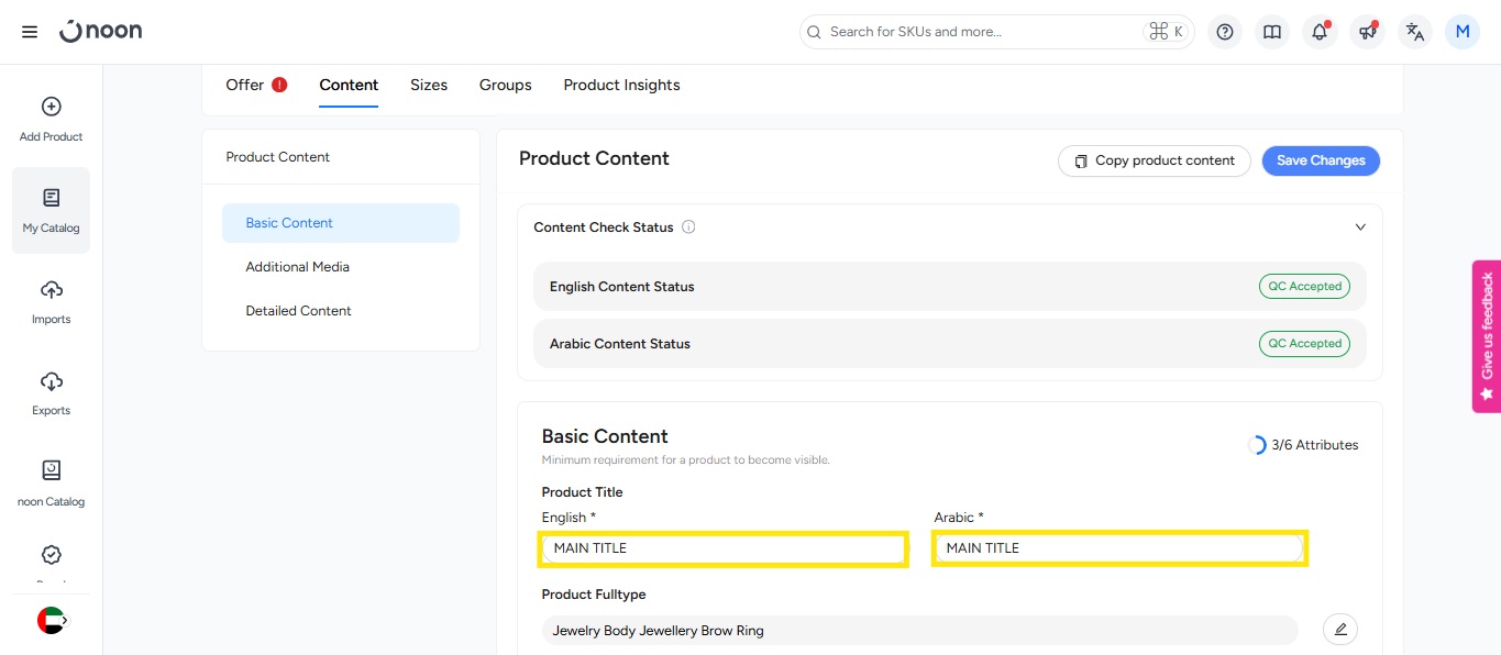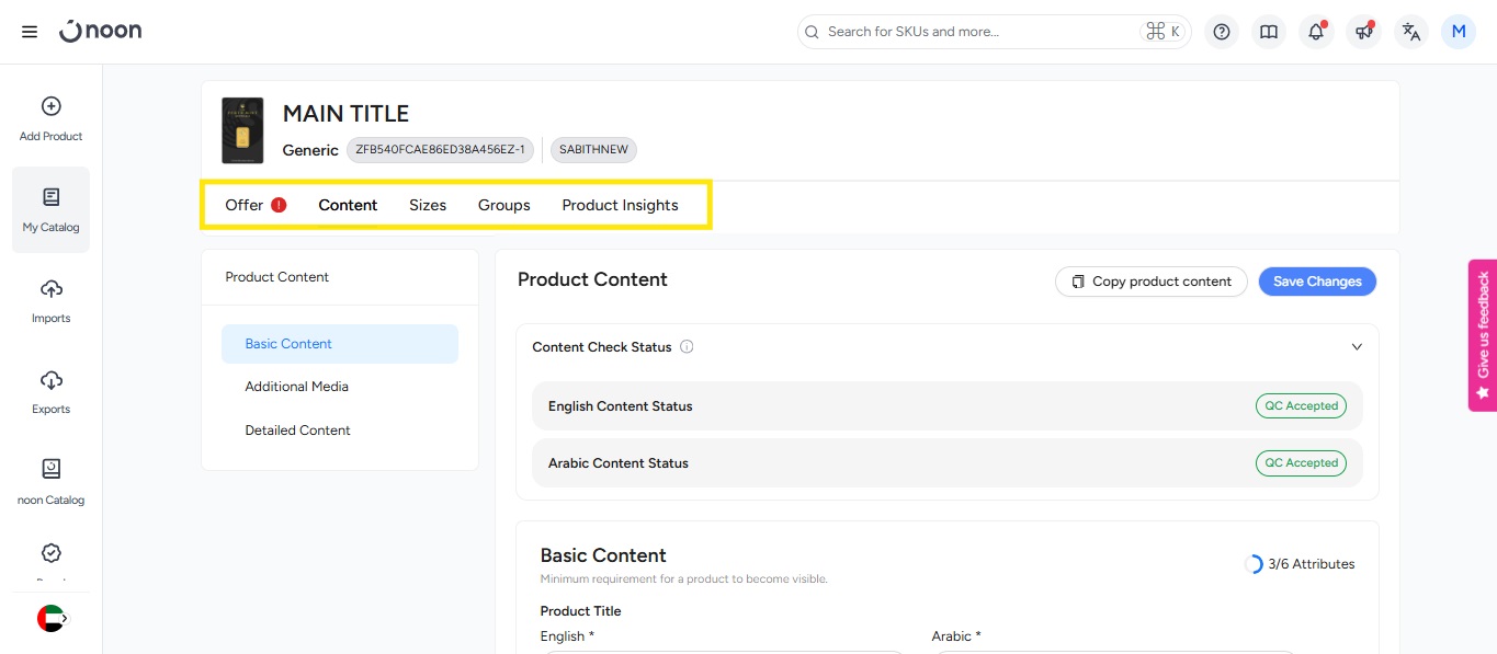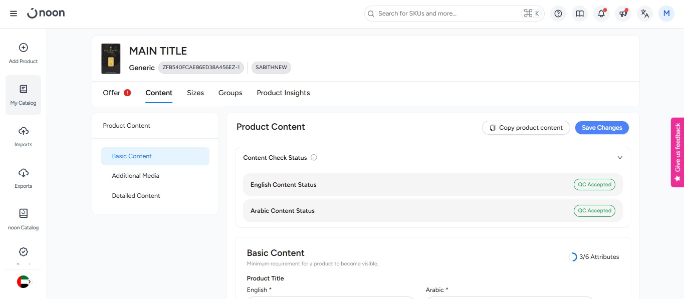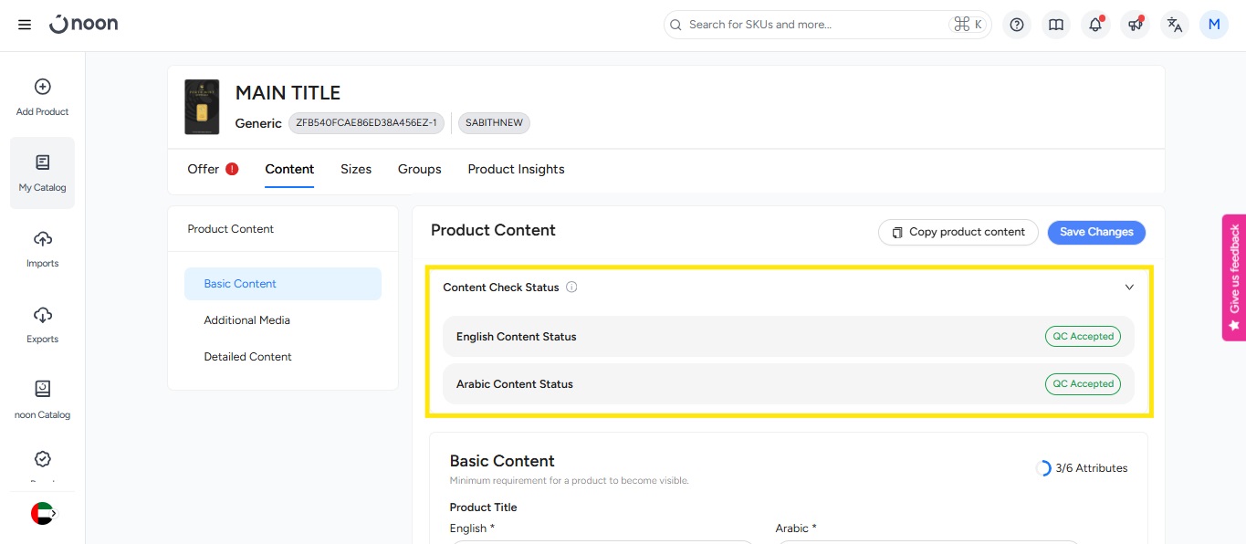 Content: The content section not only allows you to update the content for the SKU, such as images, videos, title, and other important information but also provides you with the status of the content. This status indicates the Quality check result of the content done by the noon review team.