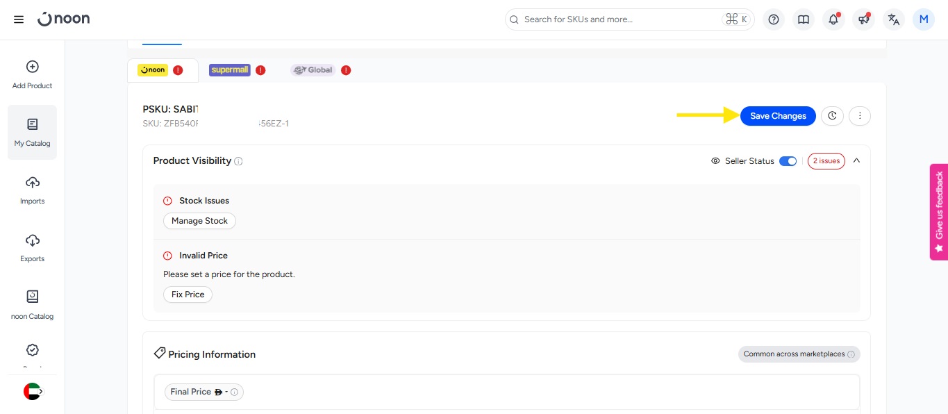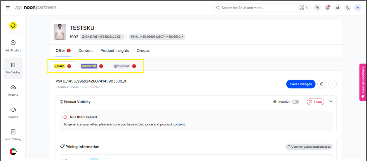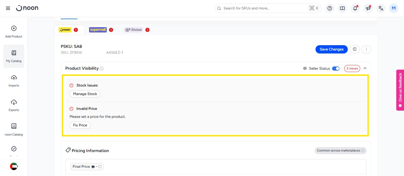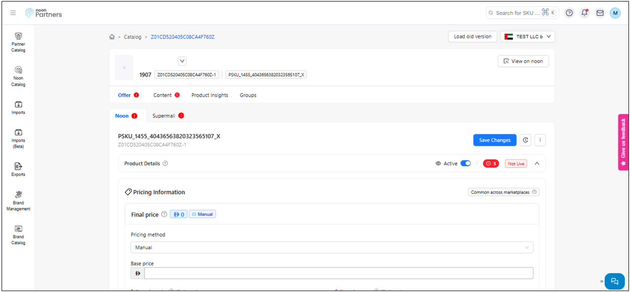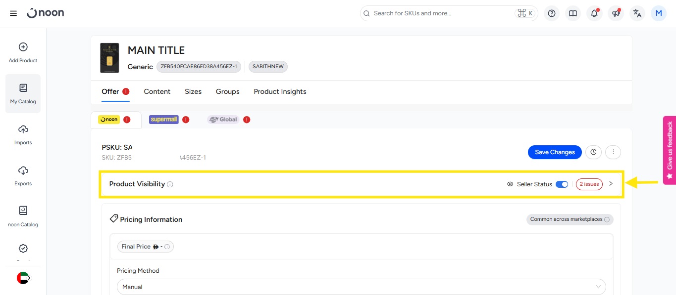 - The first section in the offer tab is the pricing. You can update the pricing of your SKU very easily in this section. You can select the pricing method, whether manual or pricing engine, to price your items. You will also view the Global range, and you need to price your item within this range.
