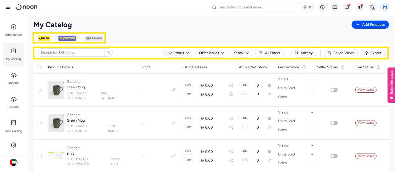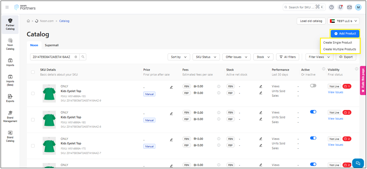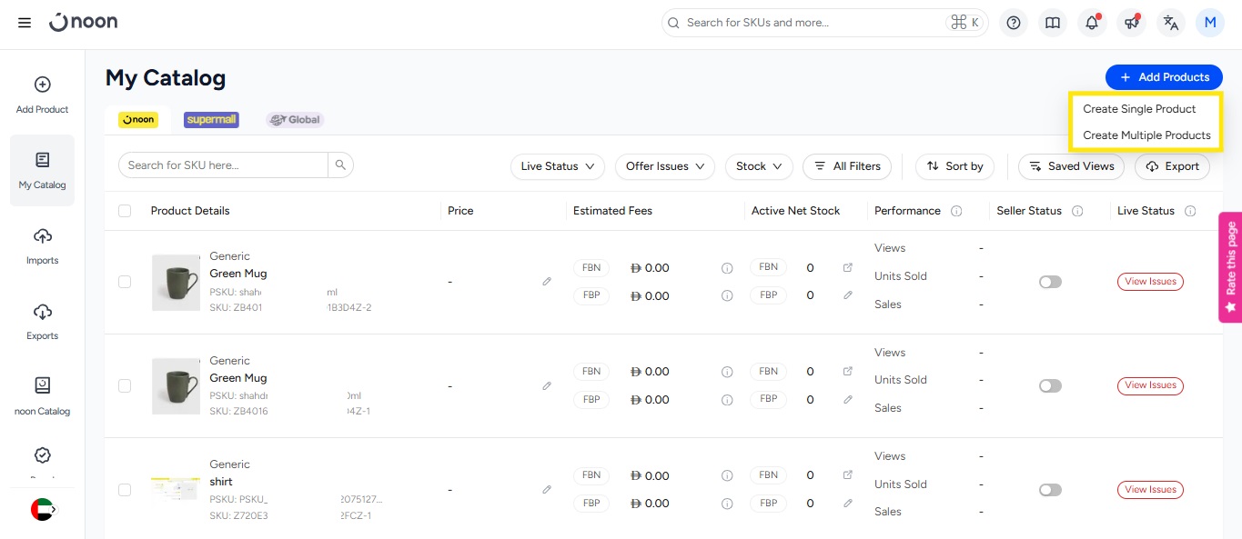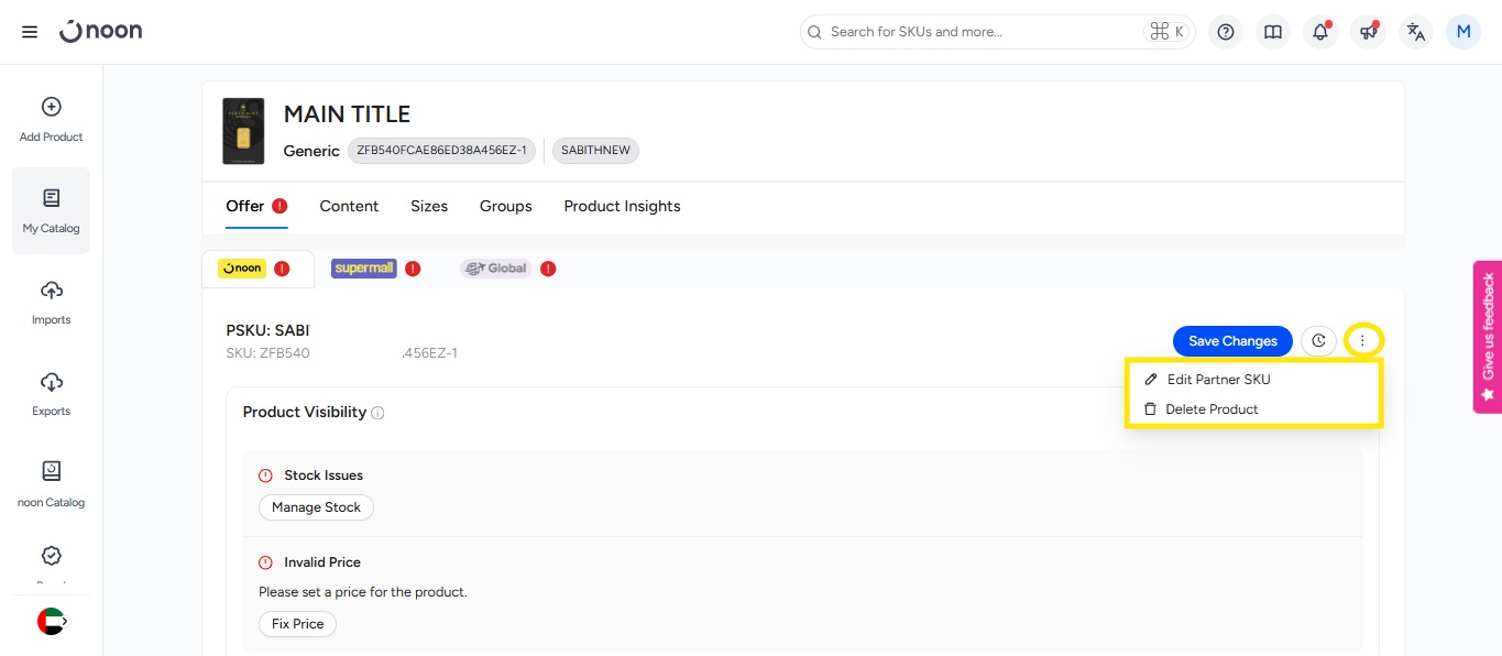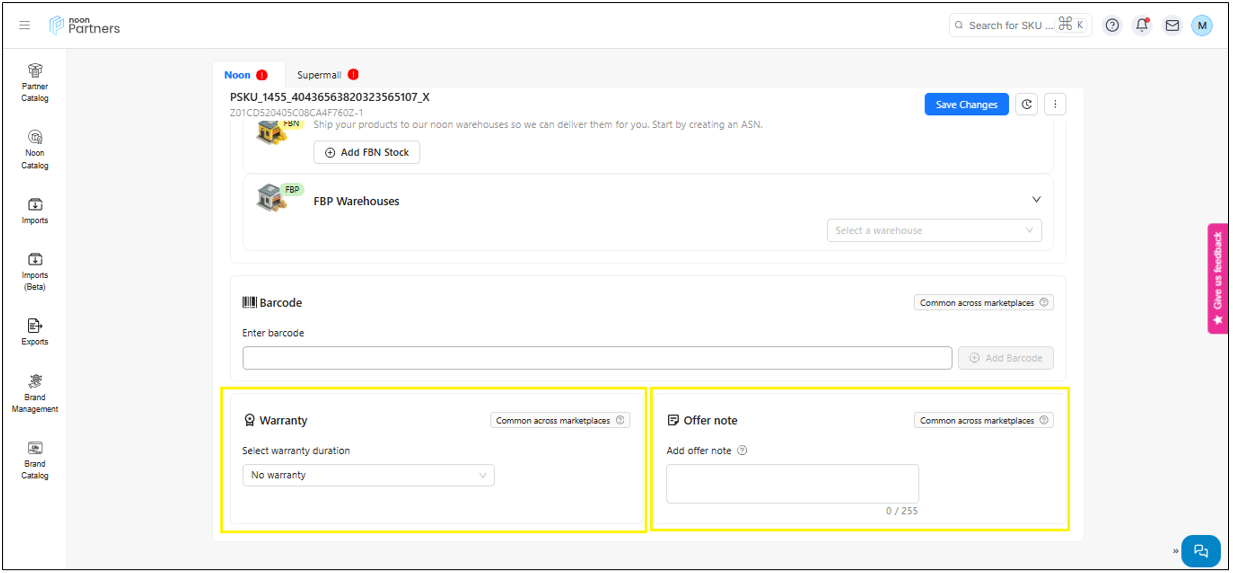 Offer: This section allows you to view the SKU and its different sizes and also update your price, stock, warranty, offer note, and barcode for each product.