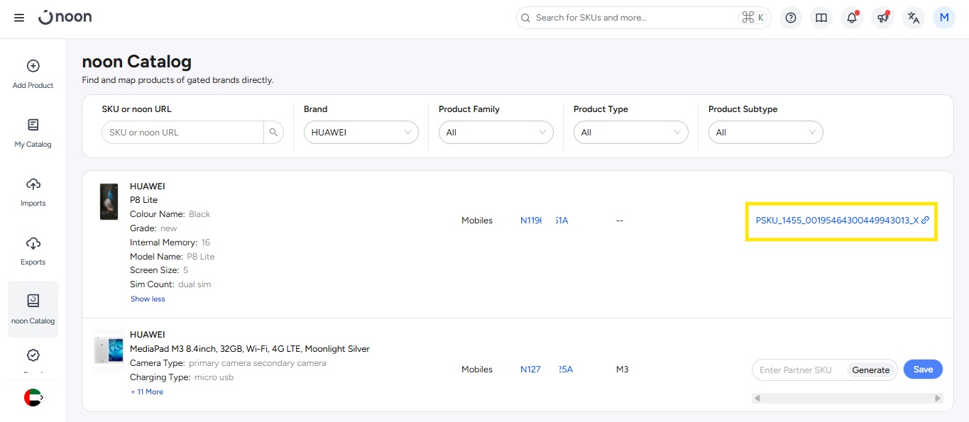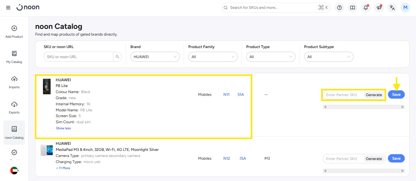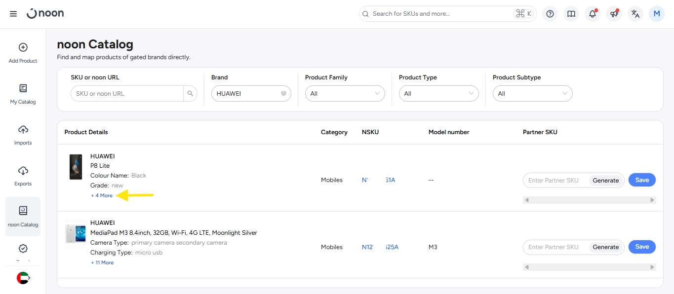 - You will be redirected to the noon catalog where you can browse if a similar SKU exists in the noon catalog. If you find a similar item click on View more to know the detailed specification of the item.
